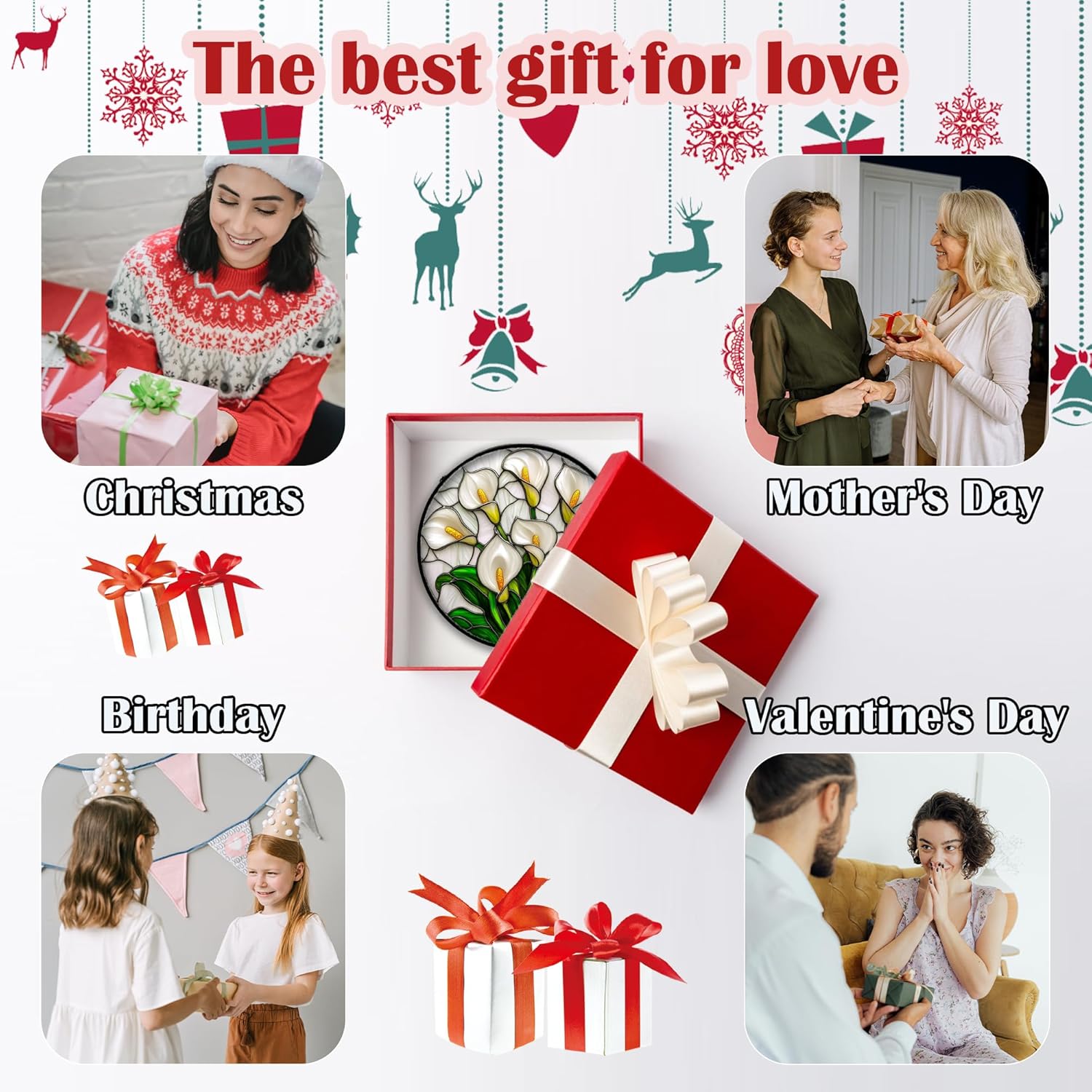 Stained Glass Window Hanging, White Calla Lily Suncatcher Diamond Glass Panel Hangings Flowers Sun Catchers Decor for Birthday for Women, Men, Wife, Aunt, and Mom 11.8x11.8 in