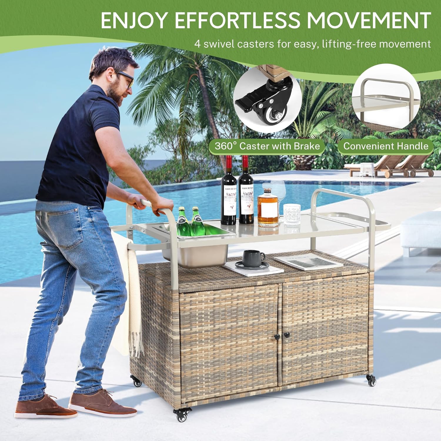 Wicker Outdoor Bar Cart with Ice Bucket, Patio Bar Table with 2 Ratten Doors Cabinet and Casters for Grill, Kitchen and Garden,Beige