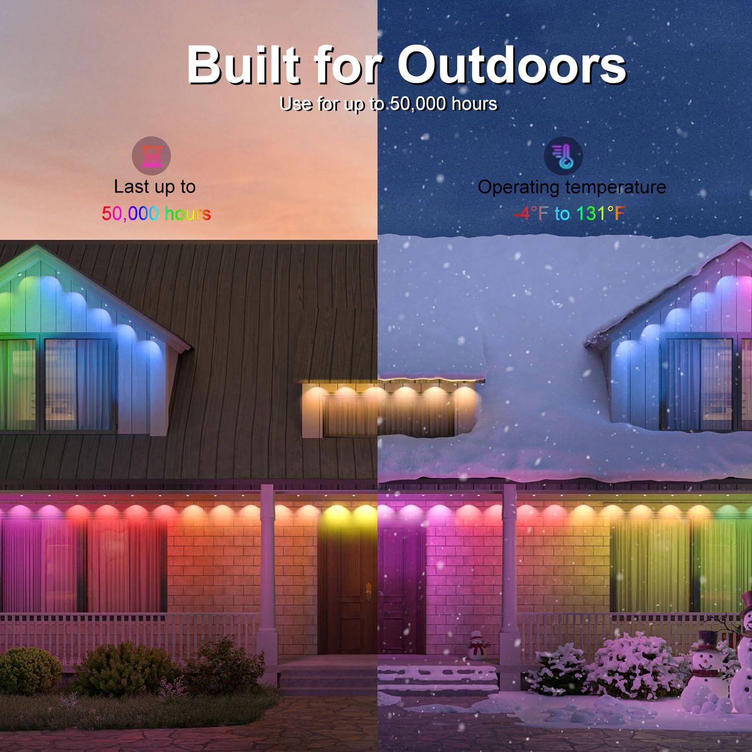 • RGB+IC Lighting: You can choose your favorite mode from a wide range of scene modes to light up Christmas with the permanent outdoor lights. This Christmas light can also be DIY set for lighting effects, suitable for various outdoor occasions.