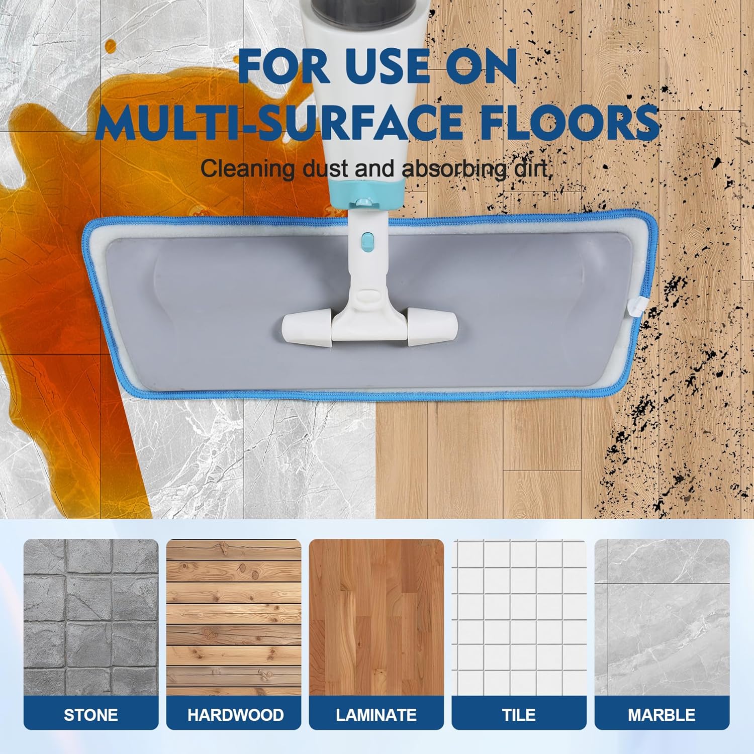 • Washable and Reusable Pads: The reusable spray mop pads are suitable for hardwood floor cleaning, tile floors, glass, laminate, ceramic, marble, etc. Both wet and dry are used for cleaning dust, hair, pet hair, and oil stains and absorbing water.