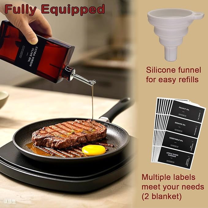 • Drip-Free Precision Pouring for Effortless Cooking: Say goodbye to spills! Our kitchen oil dispenser bottle features stainless steel drip-free pourers ensuring clean, controlled pours every time. Perfect for drizzling olive oil, dispensing vinegar, or pouring soy sauce. This dispensador de aceite de cocina (botella para aceite de cocina) makes cooking and serving precise and tidy.