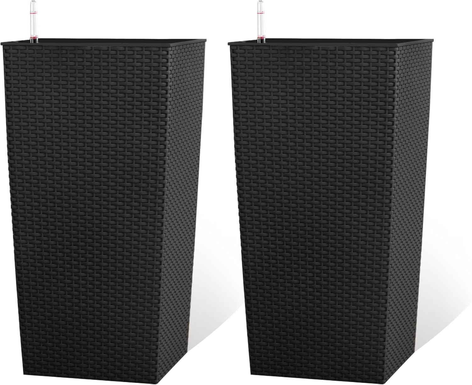2Pcs 23in High Large Plant Pots Planter-Self-Watering,Modern Planter with Drain Holes,Water Level Monitor,Inner Bucket for Indoor/Outdoor Front Porch Patio,Black Rattan