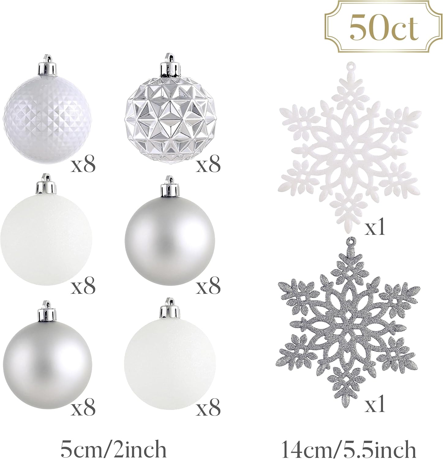 Valery Madelyn Christmas Tree Decorations Ornament Set for Fall Halloween, 50ct 2 Inches White and Silver Shatterproof Christmas Ball Ornaments Hanging Xmas Holiday Party Decor