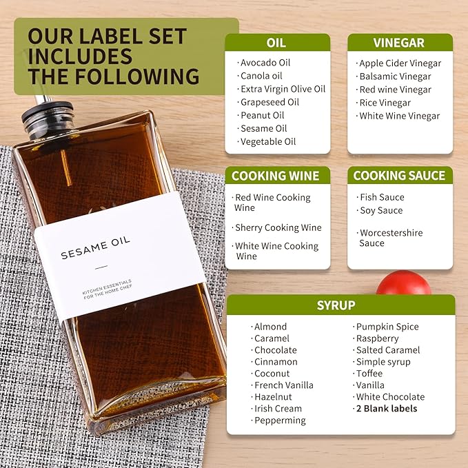 • 【Modern Kitchen Essential】: Minimalism Inspired Cooking Oil Dispenser for Kitchen. This Set Includes Three High-quality 17 Oz (500 Ml) Glass kitchen Oil Dispensers, three spouts, a funnel, a make-pen and a 32 Label Set.
