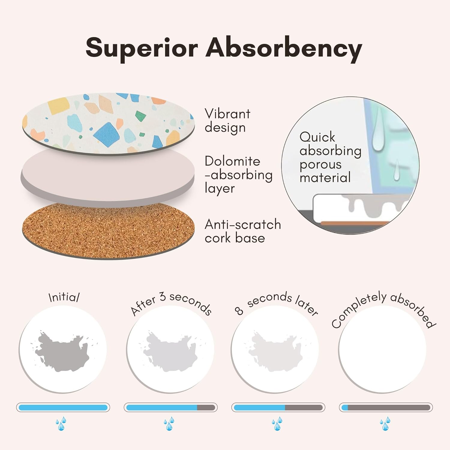 • Highly Absorbent for Hot & Cold Drinks: Our absorbent coasters are made of quality diatomite that absorbs condensation from cold drinks, spills from hot drinks and the absorbency will not detoriate over time.