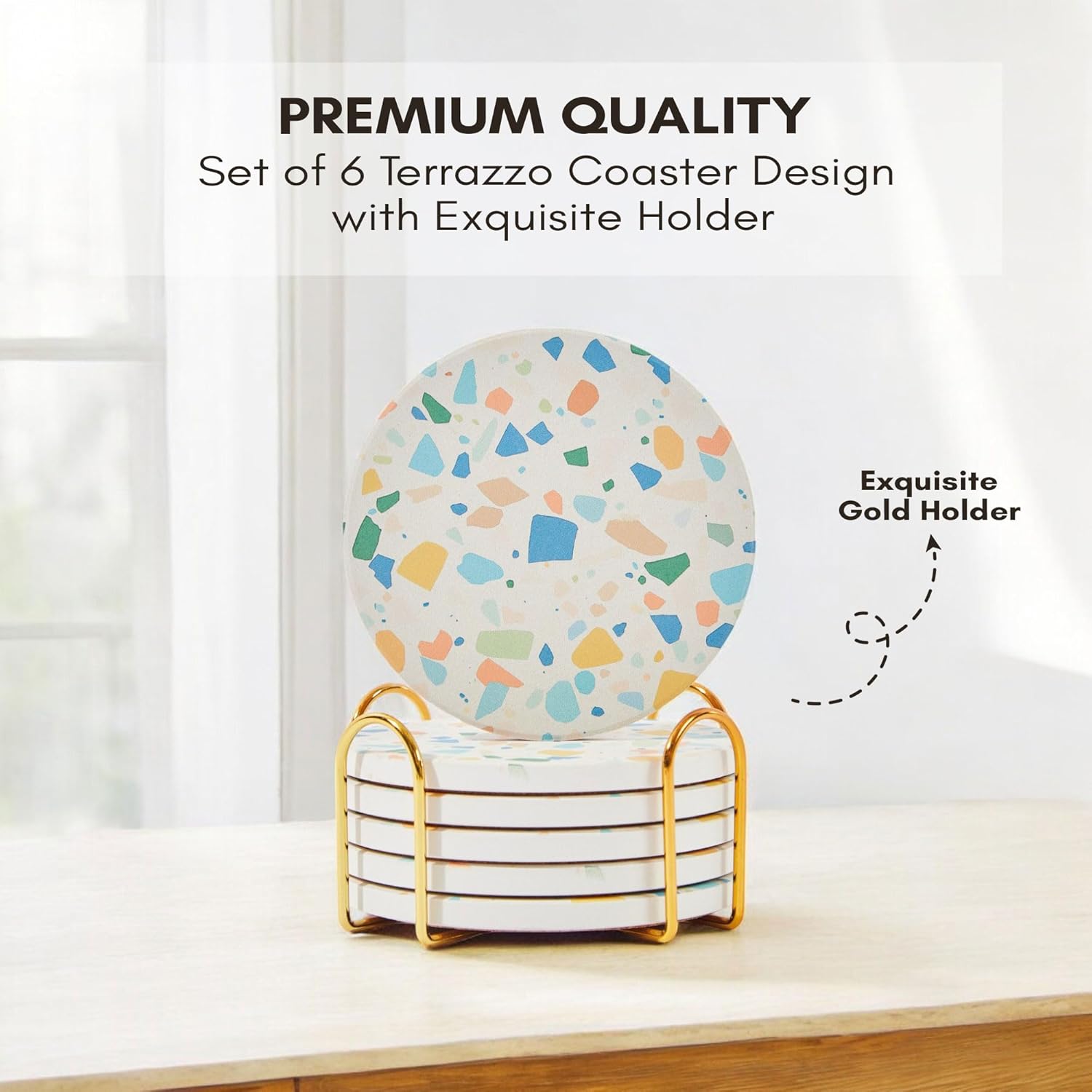 Absorbent Coaster Set of 6 with Holder, Drink Coasters for Coffee Table, Kitchen, Home Decor, Cute Ceramic Round Coasters, Alternative to Silicone, Cork or Glass Coaster (Color Pop)