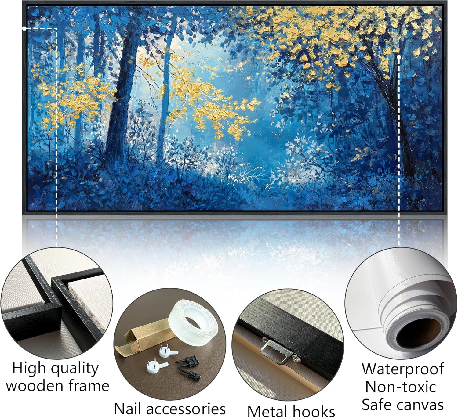 • Blue and Gold Canvas Wall Art Size:This 29×58 inches canvas wall art features a serene forest landscape with trees, blending blue and gold tones to create a modern yet timeless look for your living room, bedroom, or office.
