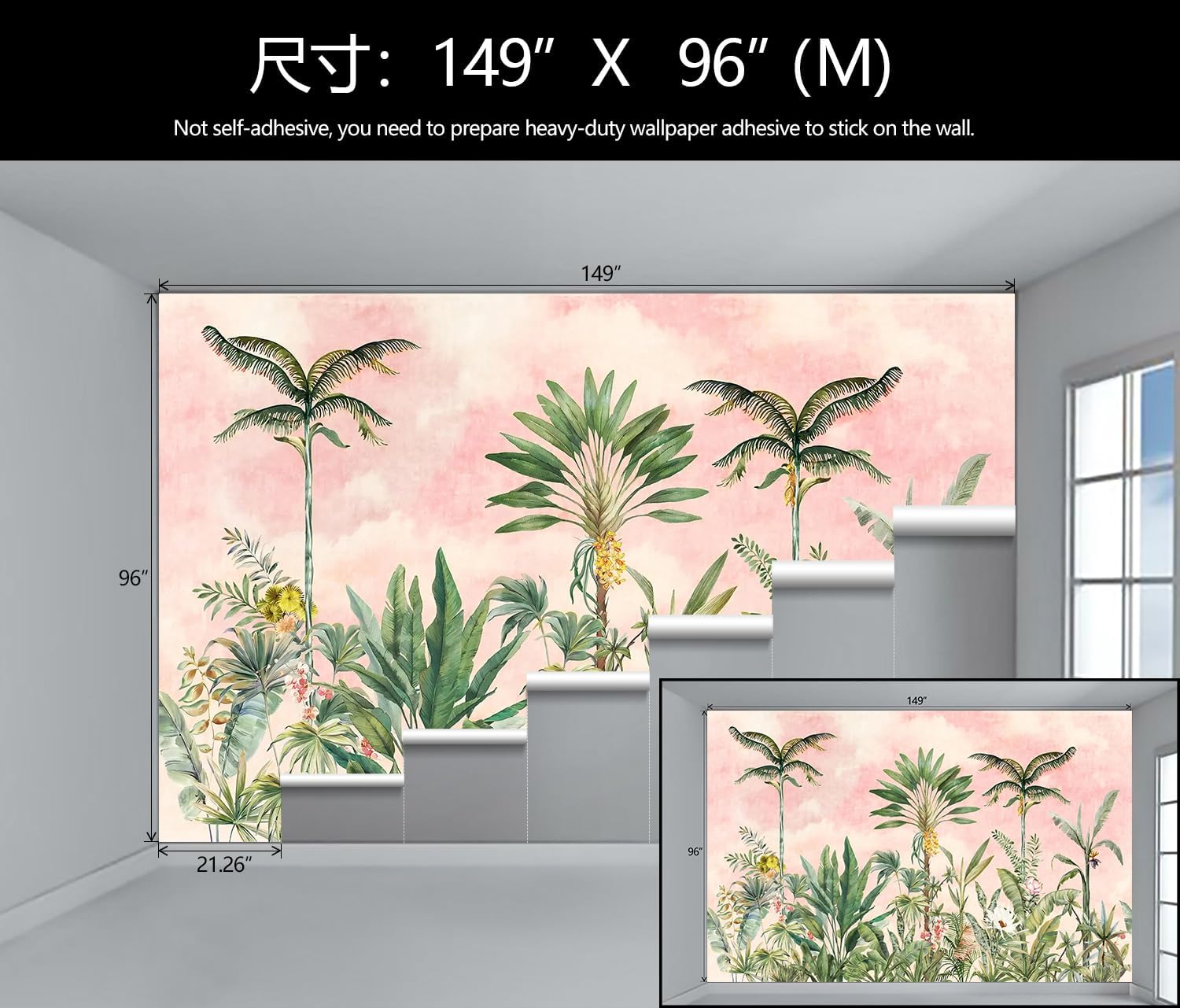 Watercolor Pink Tropical Botanical Leaf Wallpaper Mural for Nursery Girls Bedroom (Not Peel and Stick)