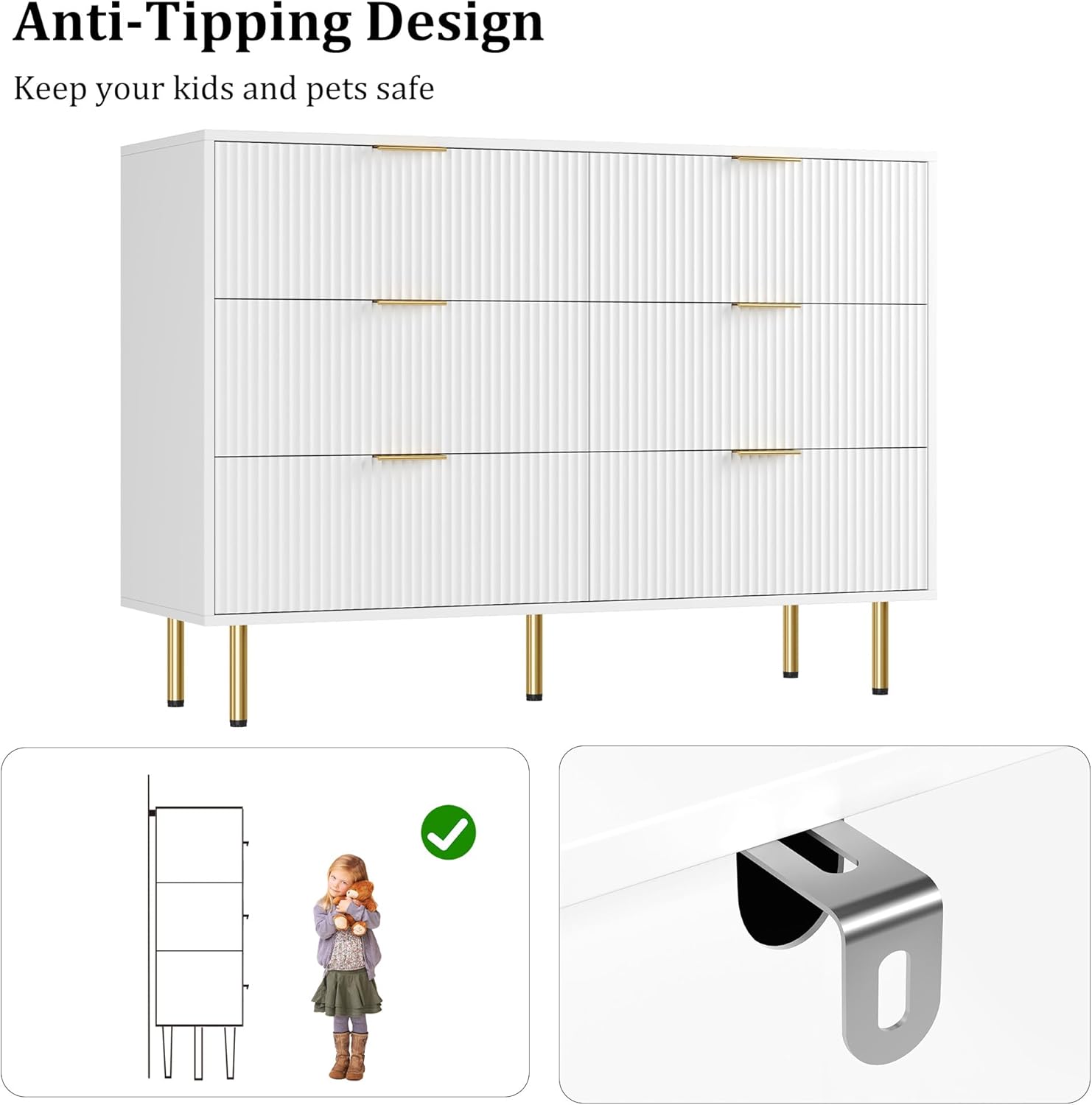 GarveeHome Fluted Wood 6 Drawers Dresser for Bedroom, Large Modern Chest of Drawers, White Dresser with Gold Handle, Wood Drawer Organizer for Bedroom, Living Room, Hallway, Entryway