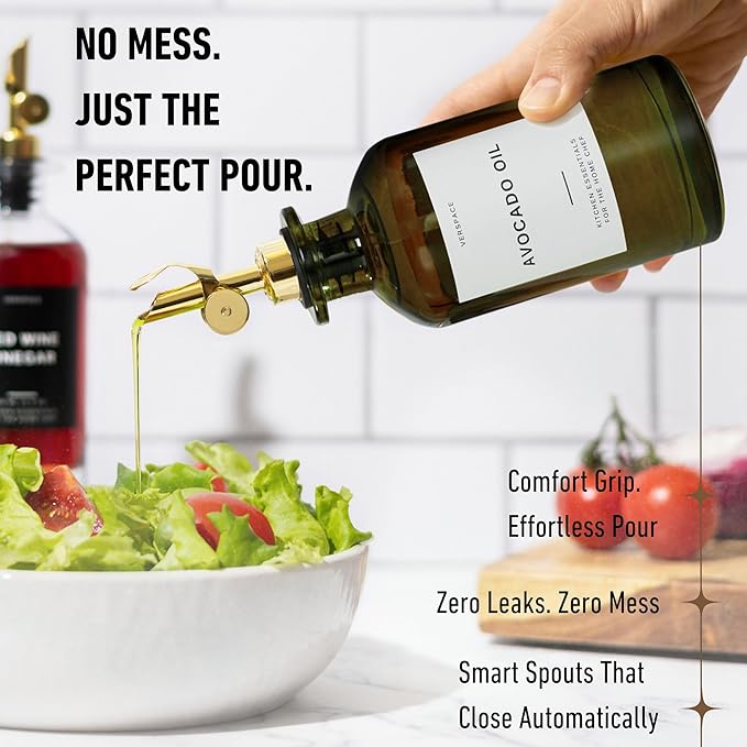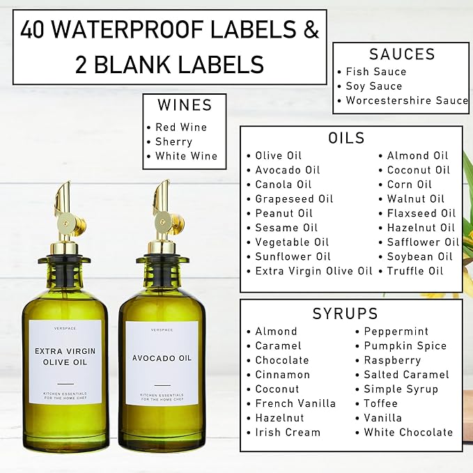 • THE ULTIMATE OIL BOTTLES FOR KITCHEN ORGANIZATION: Designed for minimalists and modern chefs, this oil dispenser for kitchen includes 2 bottles, 2 drip-free stainless steel spouts, a funnel, and 42 waterproof labels. Everything you need for a clutter-free, chic cooking space.