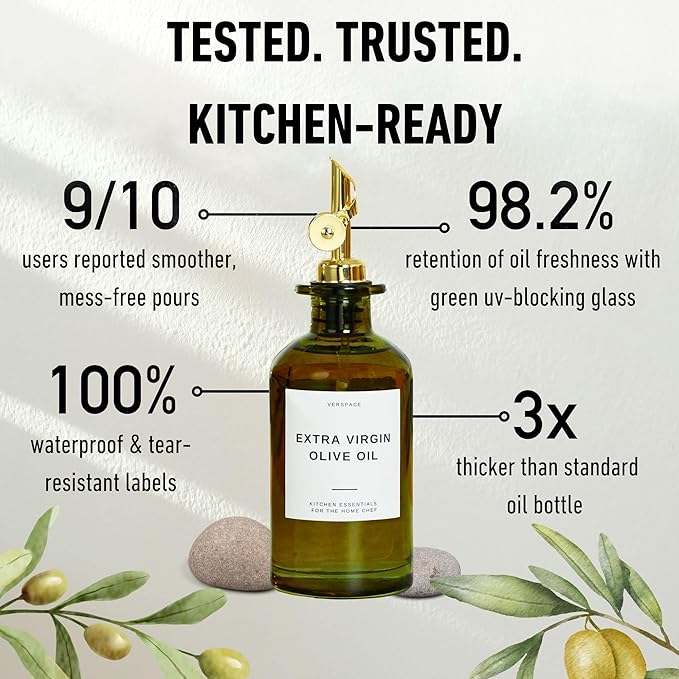 • PROTECT YOUR OIL IN STYLE: This elegant green olive oil bottle set is crafted from UV-blocking glass to preserve flavor, nutrients, and freshness. Whether you're storing extra virgin olive oil or avocado oil, your oils stay safe from sunlight and oxidation.
