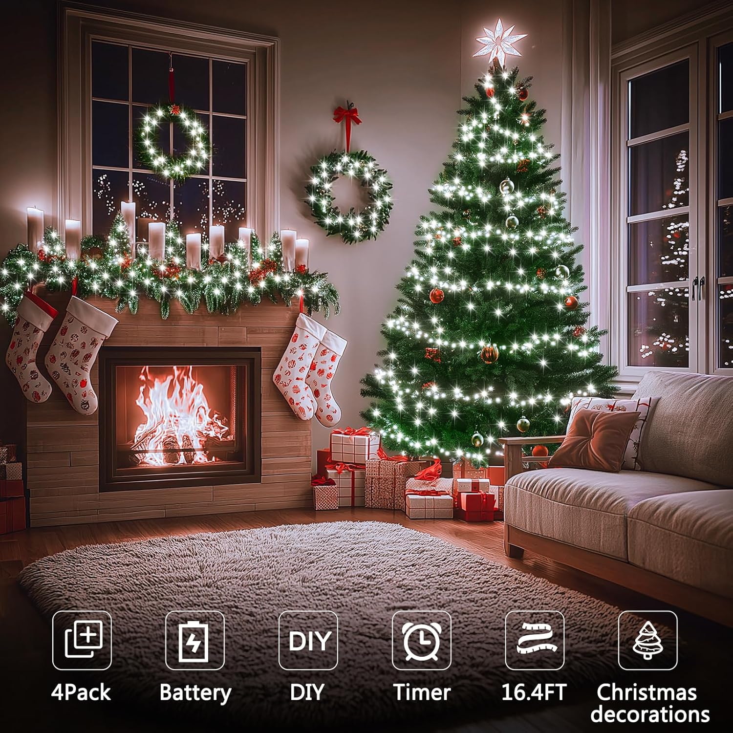 4 Pack Christmas Fairy Lights Battery Operated, 16.4FT 50 LED Dark Green Wire Twinkle Lights with Auto Timer Waterproof, Outdoor String Lights for Indoor Outdoor Bedroom Yard Decor (Cool White)