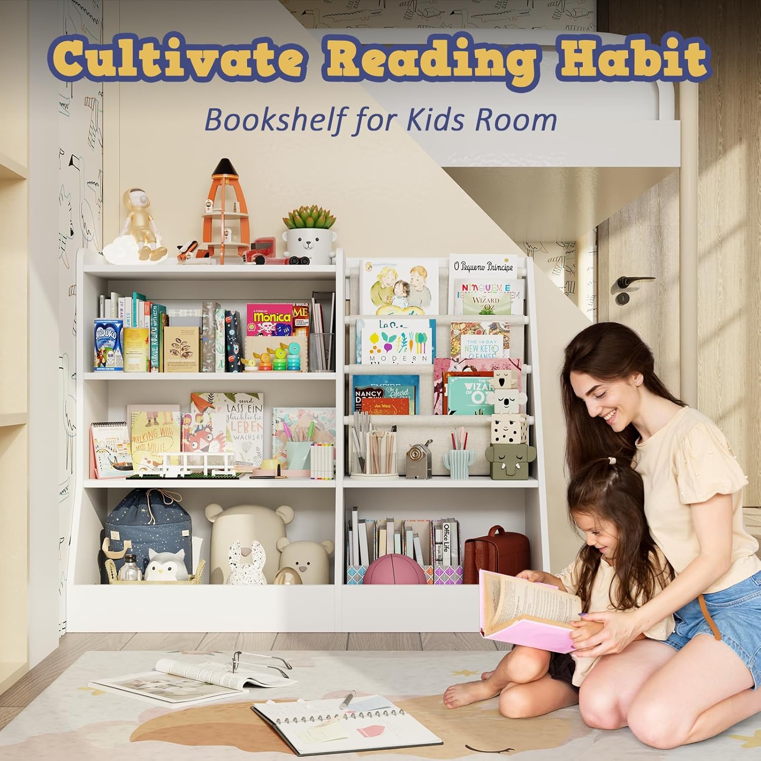 • Large Storage Space --- 4 Tier wooden structure is not only a bookshelf where can store children's books, colouring books, comic books and other book supplies, but also a great toy organizer for blocks, dolls and plush toys; deep cotton linen storage pockets on the right side for better display of front facing books, easy for child to identify and reach.
