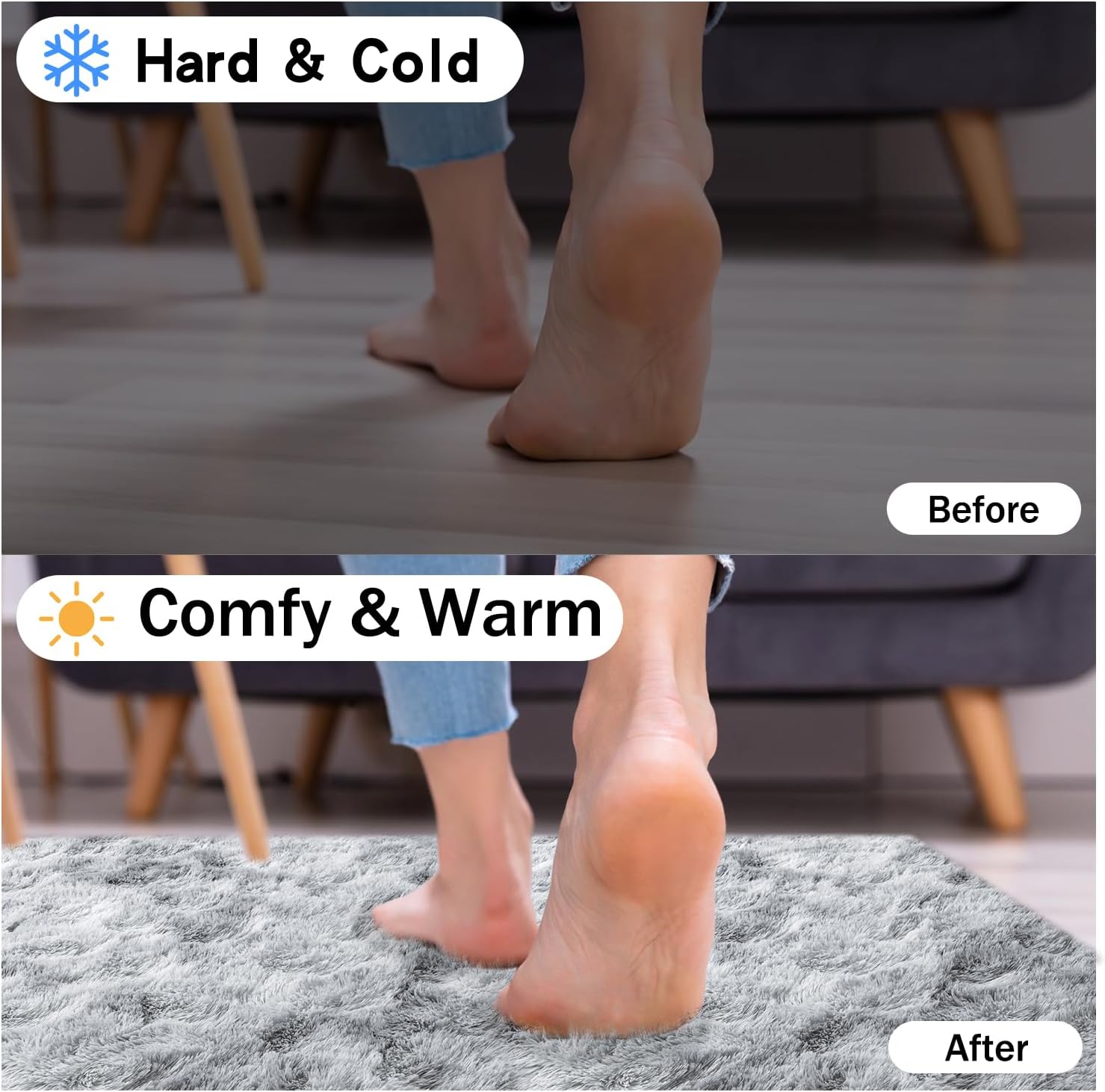• Rezutan Area Rugs-Soft Fluffy Rug: The Rezutan shag area rug is crafted from durable microfiber, ensuring a plush and incredibly comfortable experience. Its 1.7-inch high pile surface is dense and velvety to the touch, while the 0.3-inch memory foam provides superior cushioning, isolating you from the cold ground and offering soundproofing benefits. Because of the plush fur on the Soft Fluffy rug, you’ll feel like walking on the clouds when walking barefoot on the large bedroom rugs.