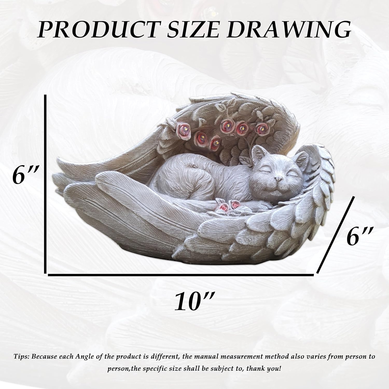 • 【Product Design】Our solar cat memorial a peaceful sleeping cat figurine with feathered and flowered angel wings, creating a beautiful and meaningful way to honor and remember beloved pets. The cat measures 10X6.3X6 inches,Our pet memorial stones a thoughtful and heartwarming way to honor the life and memory of your furry friend.Made from resin