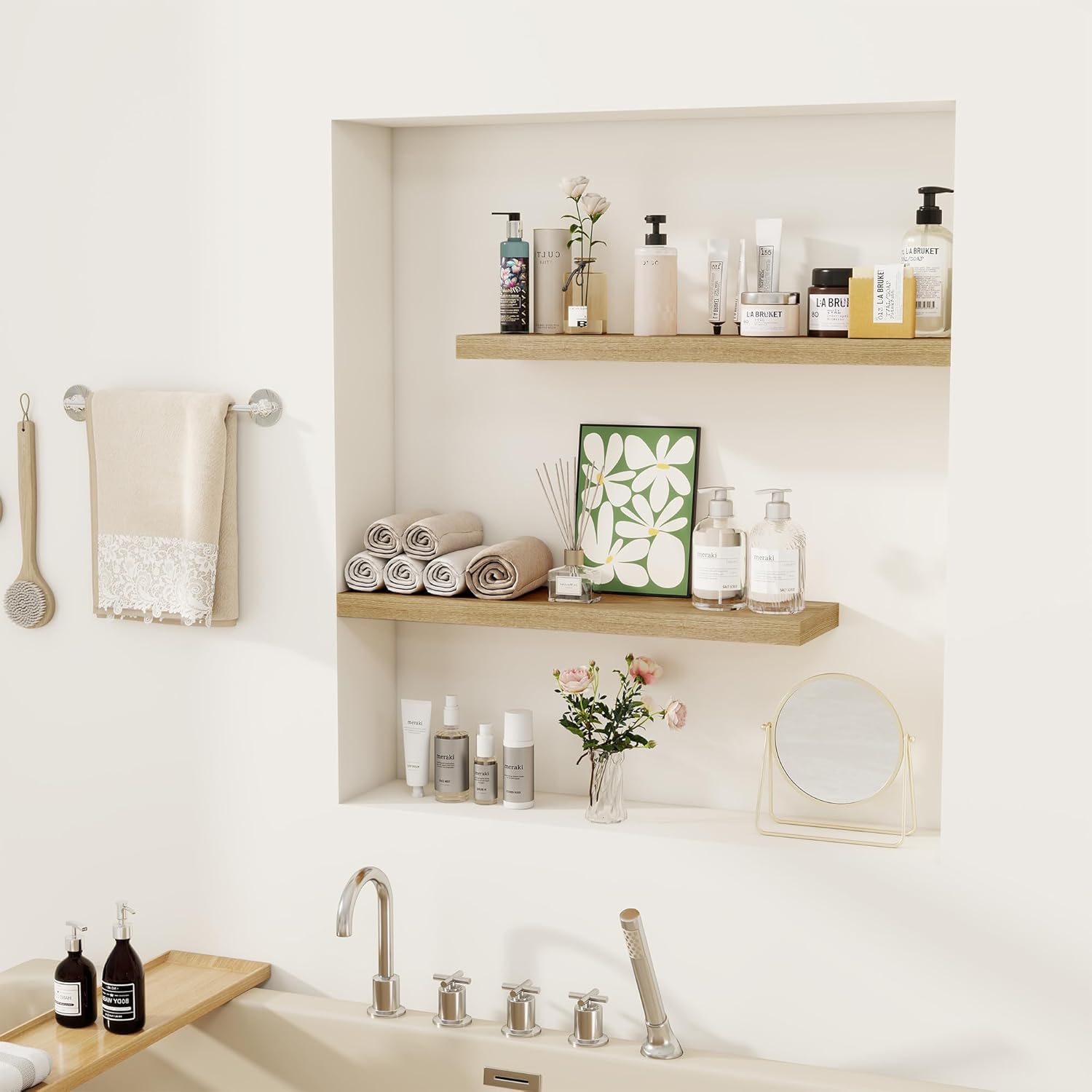 Fun Memories Floating Shelves for Wall, 24" Rustic Wood Deep Wall Mounted Shelves with Invisible Brackets for Decor & Storage, Floating Shelf for Living Room, Bathroom (Oak, Set of 2)