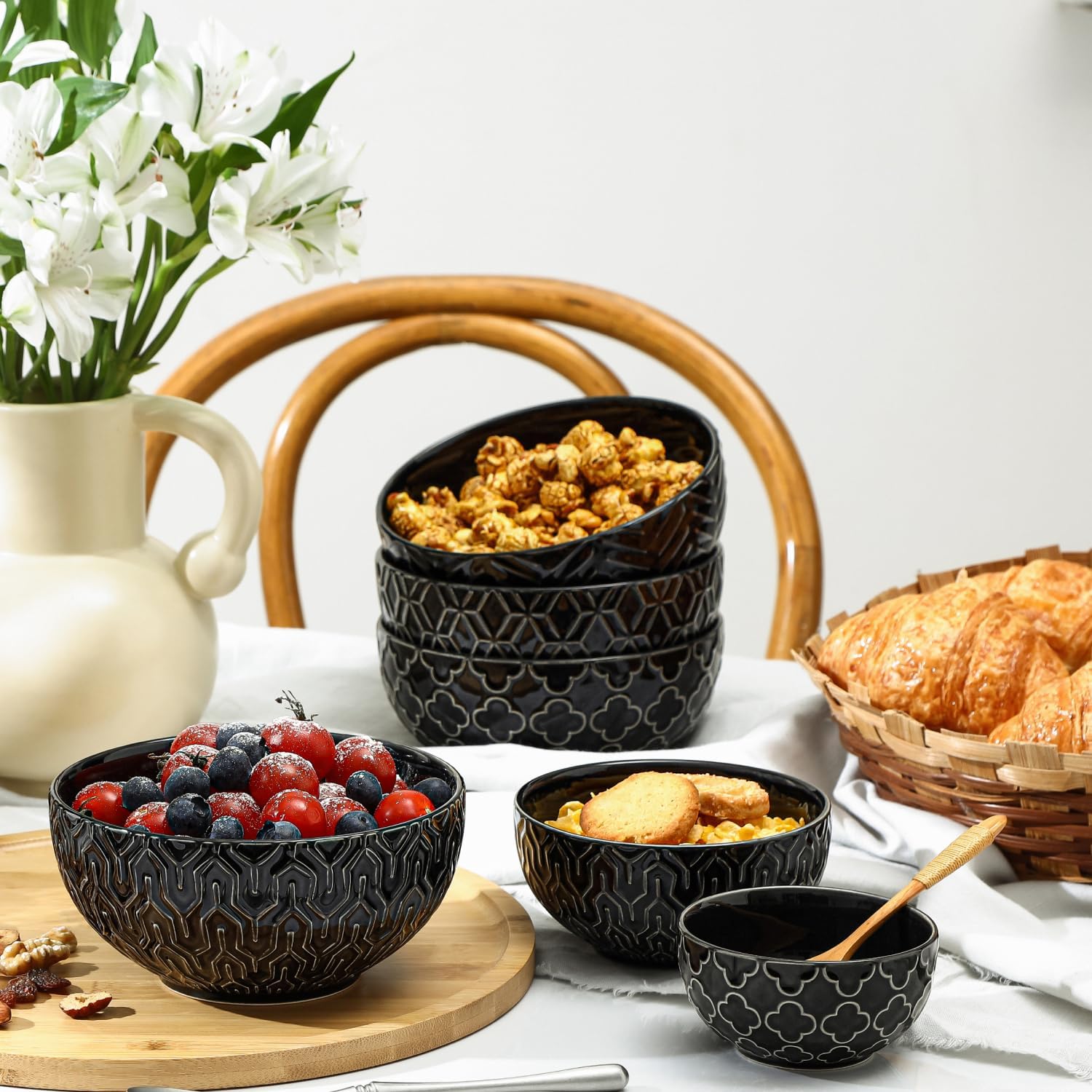 • STACKABLE & SAVE SPACE: These ceramic bowls set are stackable and save cabinet space. Cute design and stack well make your cabinet tidy and it will definitely elevated your kitchen look. Safe for dishwasher, freezer, microwave, and oven as well