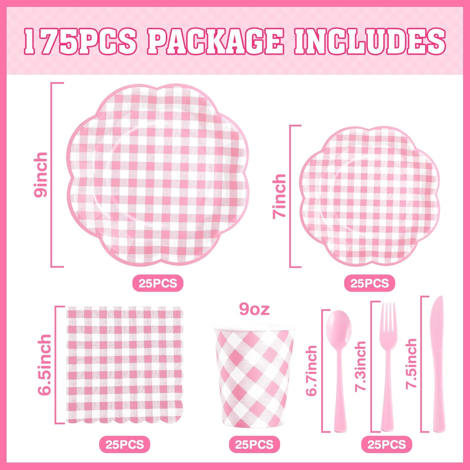 • 【Serves 25 Guests】Pink gingham plates sets includes 25pcs 9-inch pink checkered dinner plates, 25pcs 7-inch pink plaid dessert plates, 25pcs 9 oz gingham cups, 25pcs 6.5-inch scalloped gingham napkins and 25 sets of knives, forks, spoons for a total of 175 pieces. Perfect for all kinds of parties and celebrations