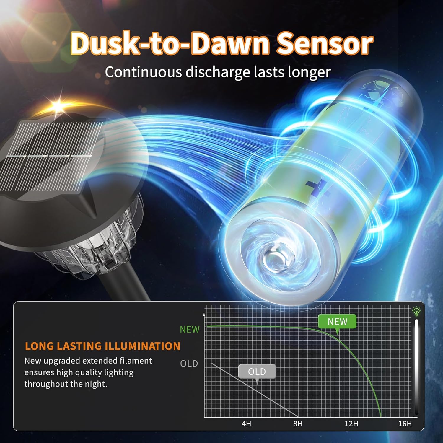 • DUSK TO DAWN LIGHT UP OUTDOOR LIGHTS: Solar powered lights automatically turn on at night and turn off at dawn which enables led pathway light conserves battery life for when it’s needed most. The solay walkway lights provide a good amount of illumination after a sunny day.
