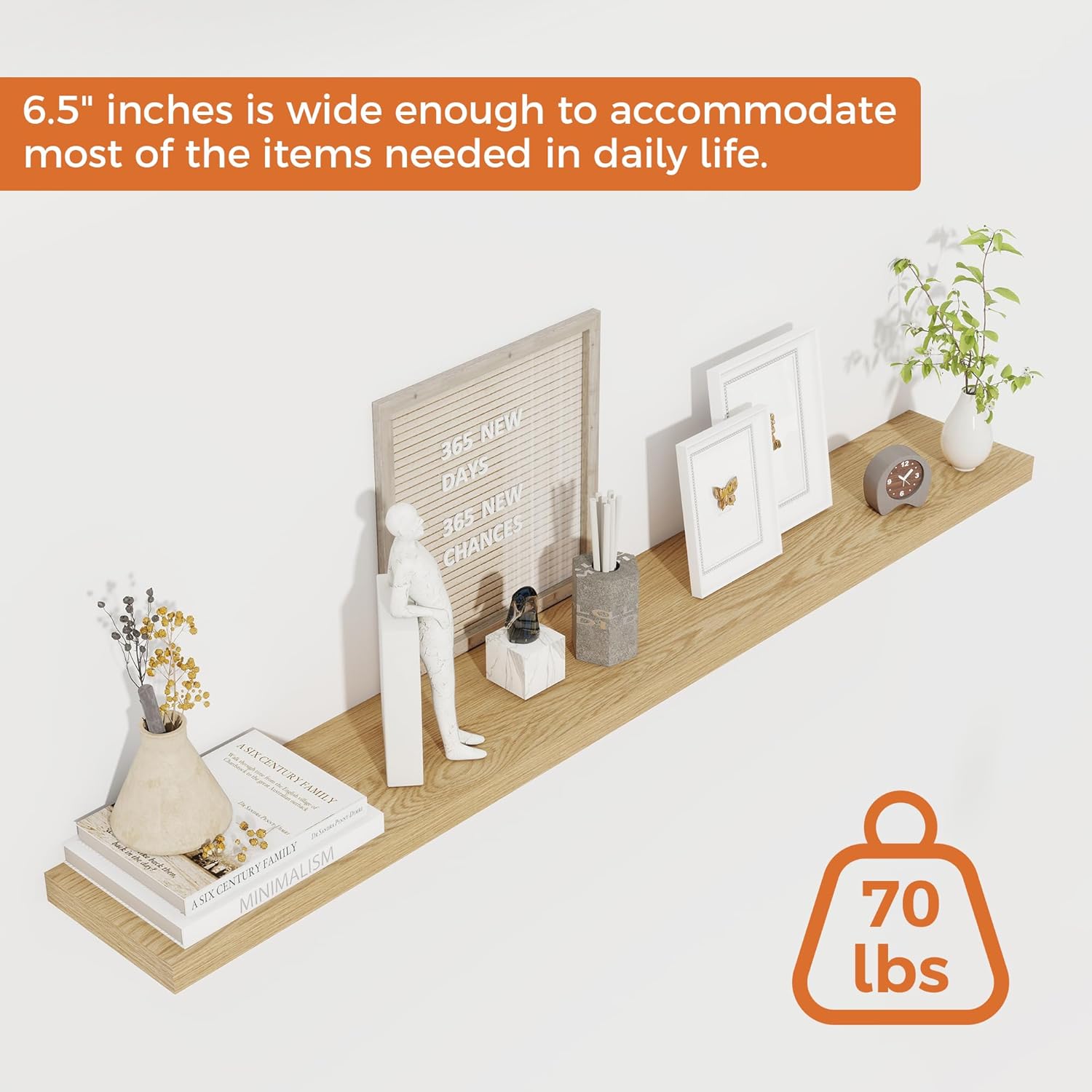 • 48-Inch Floating Shelves for Wall (Set of 2): Each shelf measures 6.5 inches in depth and 1.1 inches in thickness. This 2-piece set offers a more cost-effective and practical storage solution. Fun Memories wall shelves can be installed in a variety of ways—staggered vertically, side-by-side, or independently—to add extra storage and reduce clutter in your kitchen, bathroom, bedroom, and more. Available in multiple colors to suit different decor styles