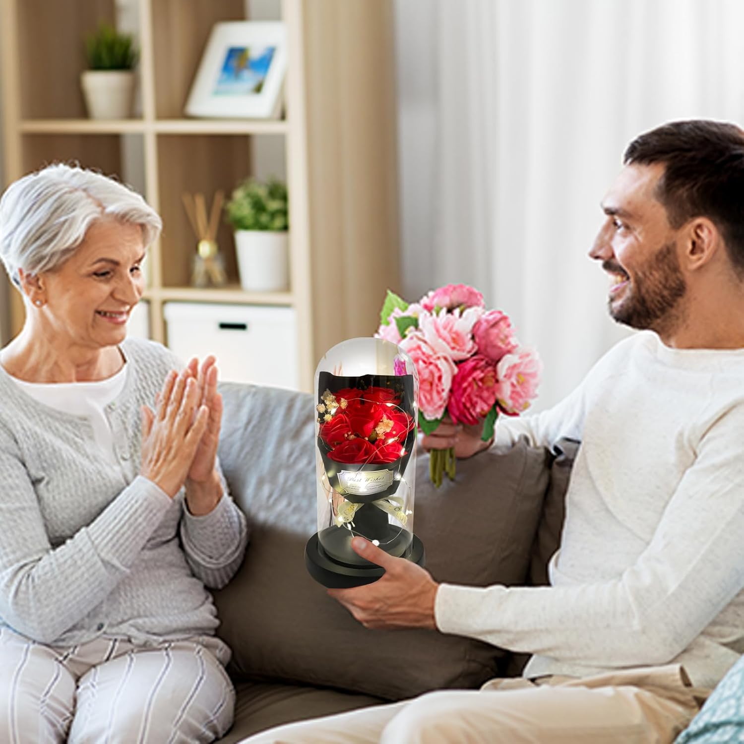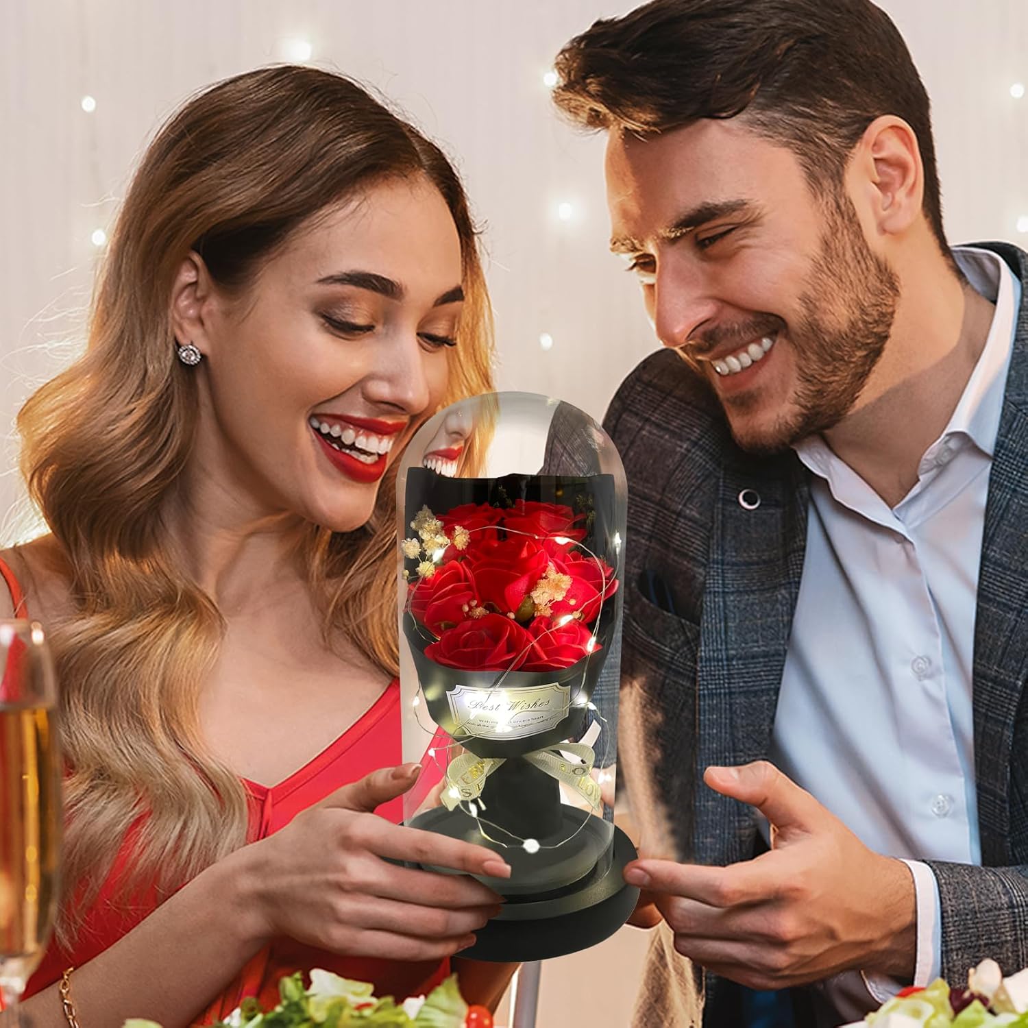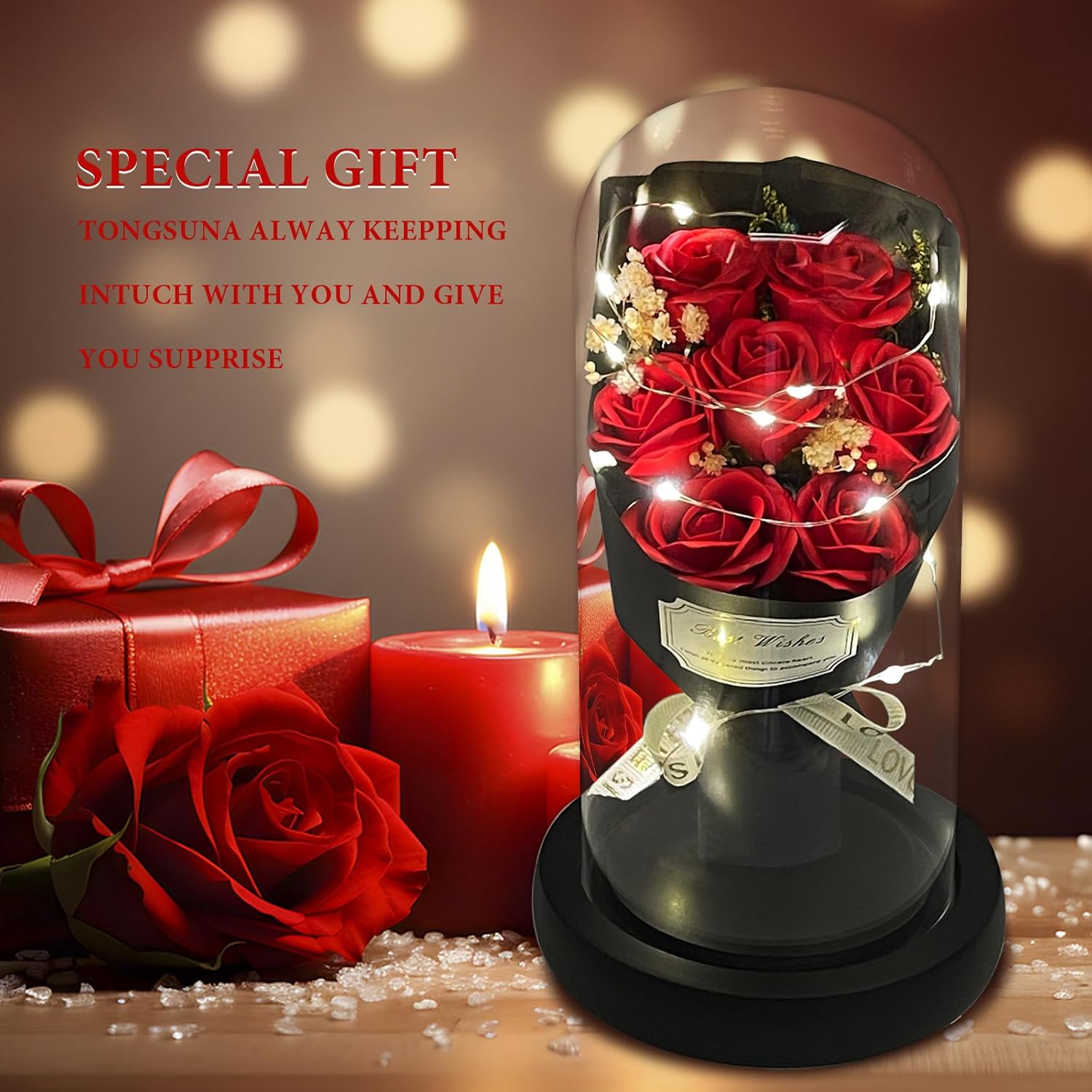 • 【Valentines Flowers Gifts Come With Happiness】:Women Gifts from daughter son. Valentines gifts for her. The twinkle lights wrapped around the flower rose bouquet in glass dome. Everyone will fascinate it when it light at romantic nigth. Get it on the special day, get happiness and sweet time.