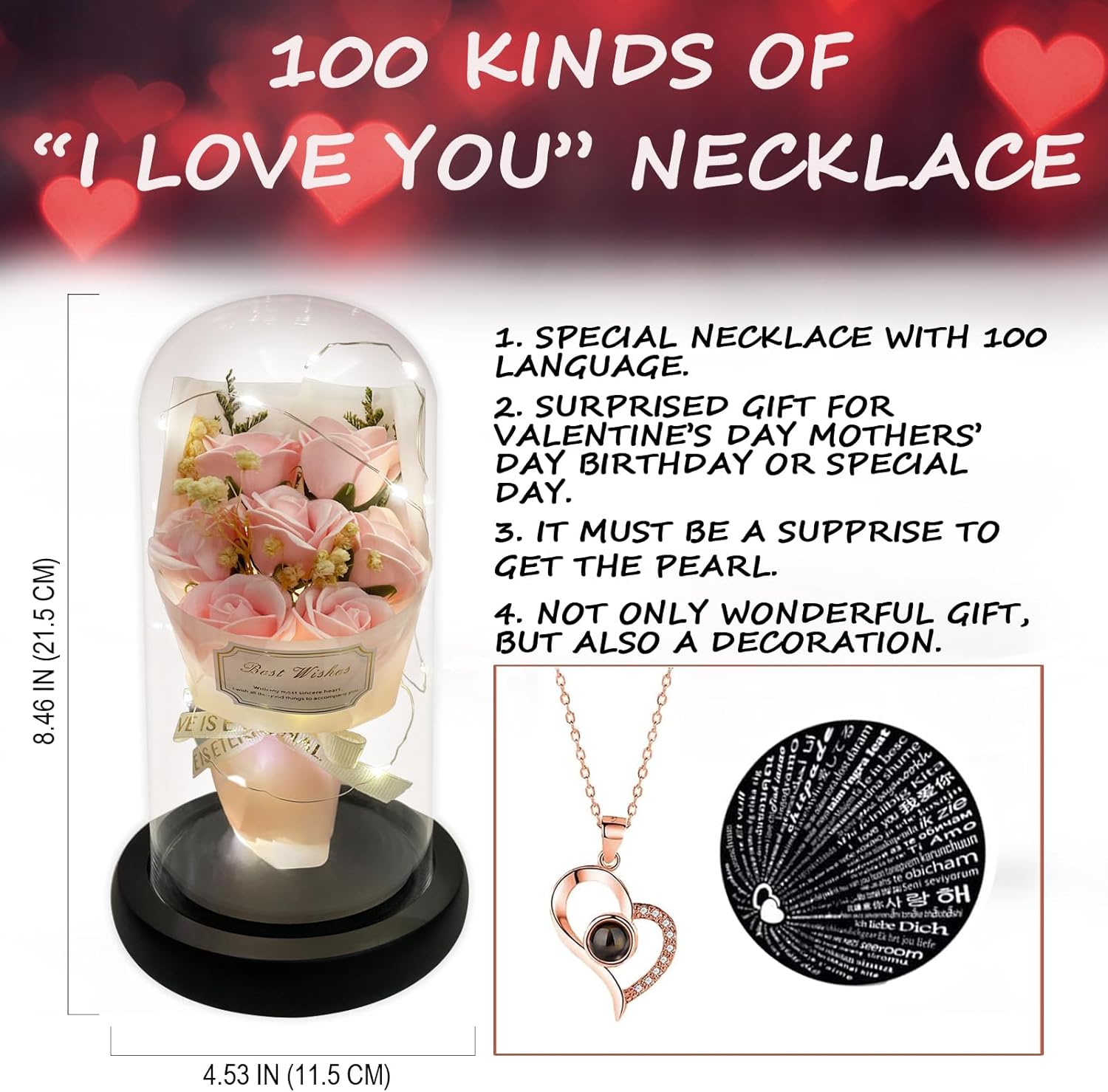 Gift for Her Forever Flower Bouquet for Delivery Prime Preserved Pink Roses Glass Dome LED Light 100 Languages I LOVE YOU Necklace Mothers Day Birthday Romantic Valentines Gift for Wife Women Mom
