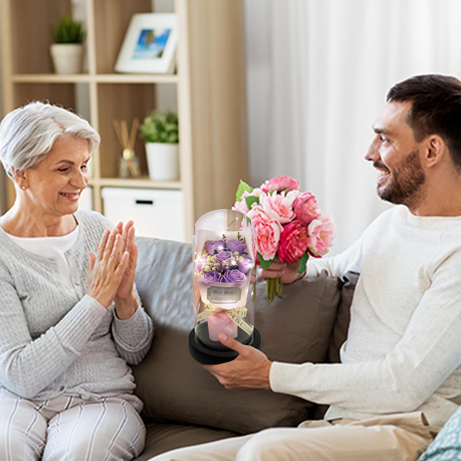 Gift for Her Forever Flower Bouquet for Delivery Prime Preserved Purple Roses Glass Dome LED Light 100 Languages I LOVE YOU Necklace Mothers Day Birthday Romantic Valentines Gift for Wife Women Mom
