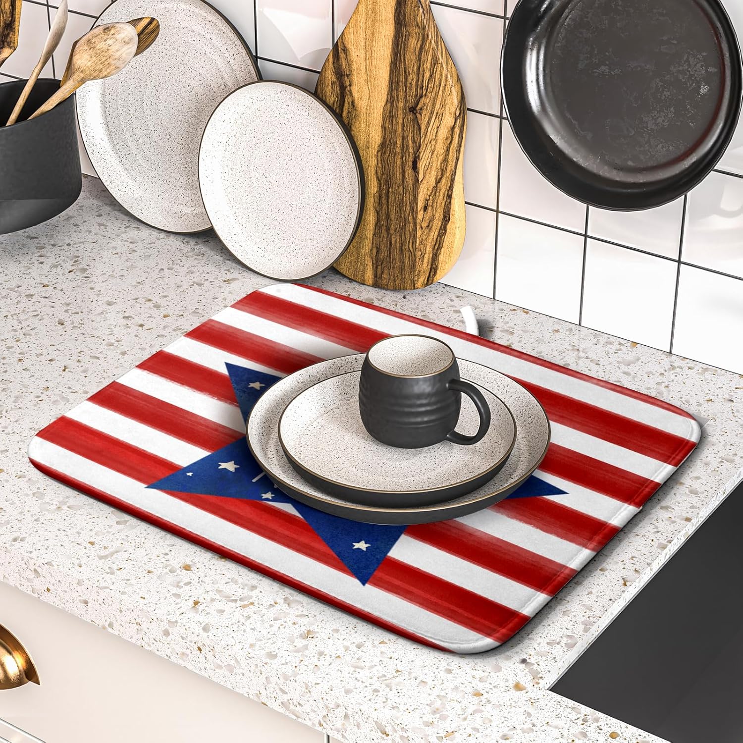 • 【Absorbent】The 4th of July dish drying mat is a 3-ply design made of absorbent microfiber, composite sponge, and cotton sateen fabric, the dish drying pad absorbs 4X its weight in water. Perfect for air-drying dishes, glasses, pots, pans, bottles, fruits, and vegetables