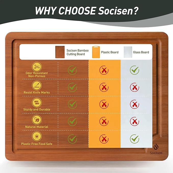 • Knife-Safe Surface for Edge Preservation: Our bamboo cutting board features a durable and thick surface. Meticulously polished to be ultra-smooth and flat, it has no burrs, cracks, or splinters. The bamboo cutting board is gentle on knives, reducing dulling and blade damage. Whether using a serrated knife for bread or a chef's knife for vegetables, the wood cutting board prevents blades from dulling quickly, saving you time on sharpening and allowing more time for enjoying your cooking.
