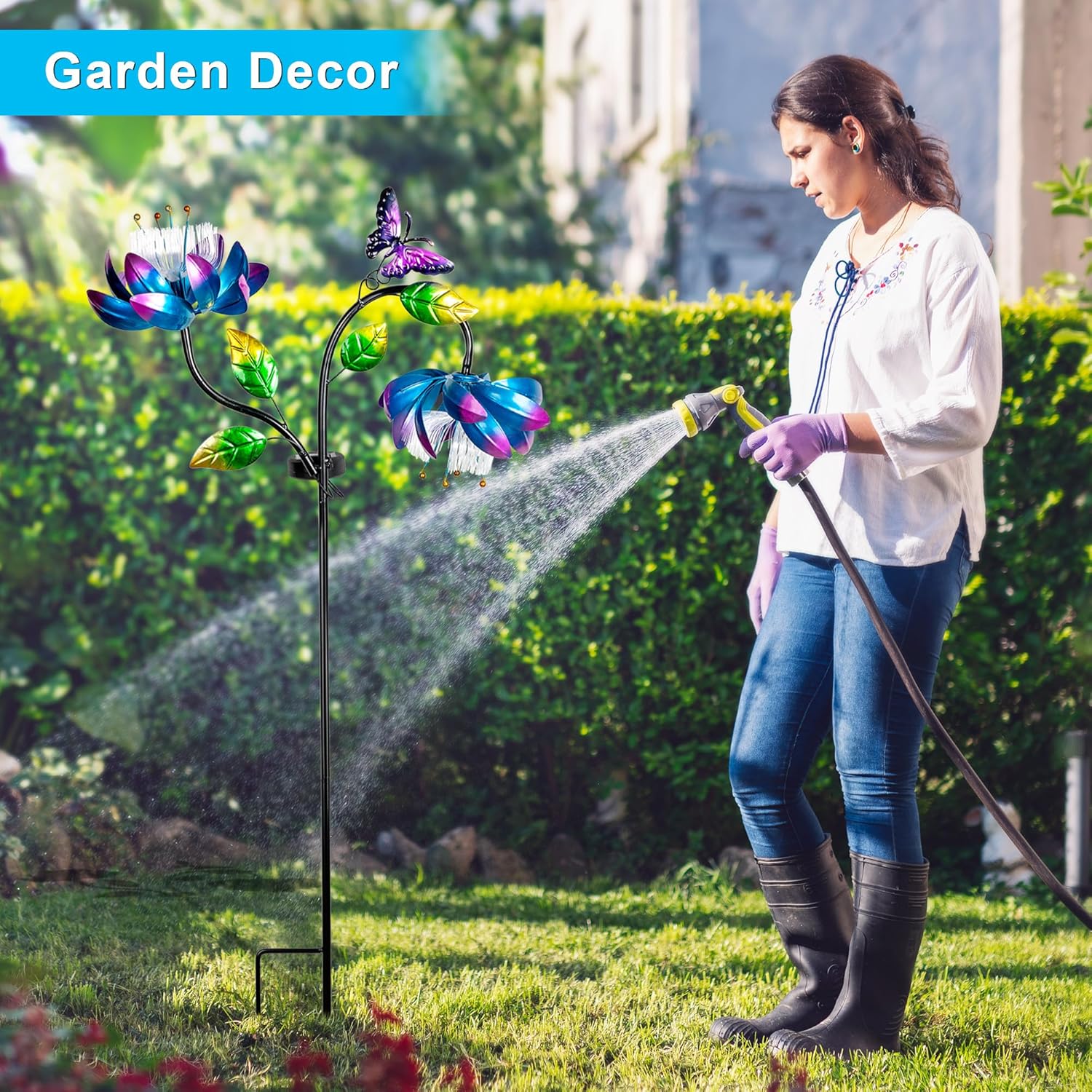 50'' Solar Powered Kinetic Wind Spinner Sculpture Blue Lotus Metal Stake Spinner for Patio, Lawn and Garden Decor Weather Resistant Outdoor Art with Dual Lotus with Butterfly Design