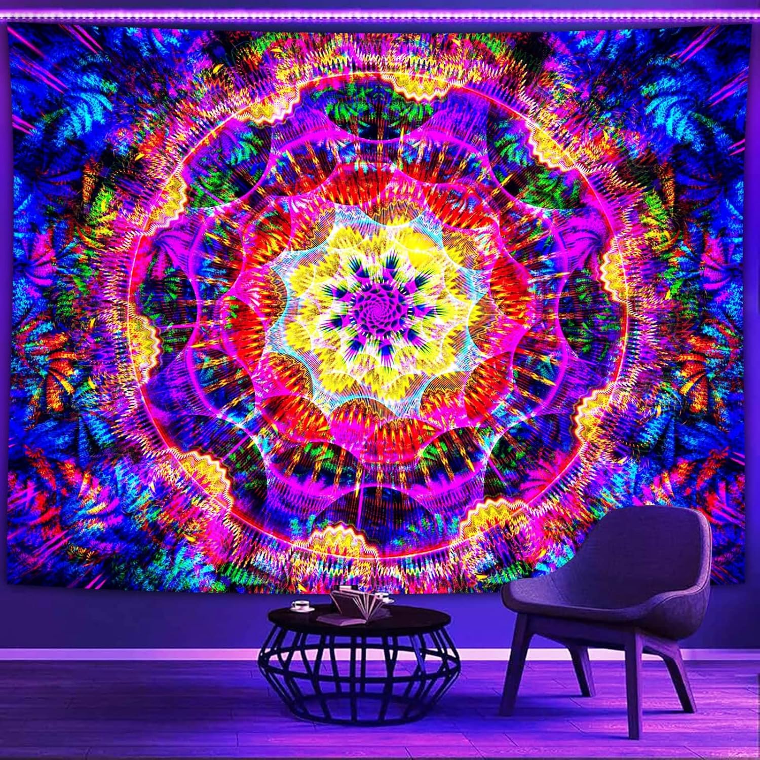 PSYHILAR Blacklight Mandala Tapestry for Bedroom, Psychedelic Black Light Posters for Adults and Teens, Colorful UV Reactive Aesthetic Bohemian Art Wall Hanging Decor (90 x 70 Inches)