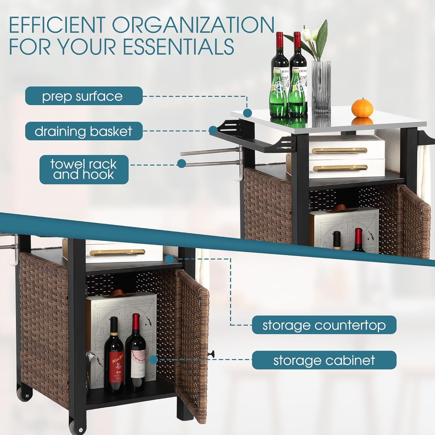 • ORGANIZATION FOR YOUR ESSENTIALS: With this outdoor bar catr dedicated spaces like a towel rack, draining basket, prep surface, storage countertop, and a storage cabinet, ensures that your bar tools and serving essentials are always within easy reach