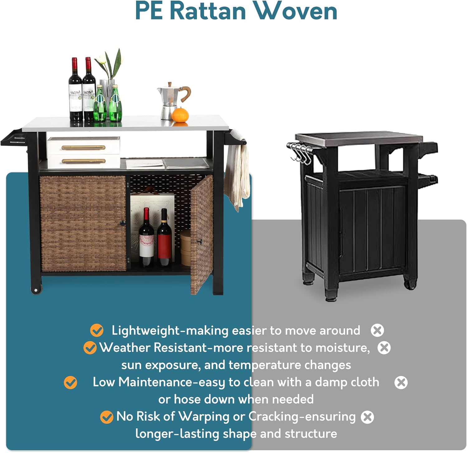 • VERSATILE FUNCTIONALITY: The stainless steel top of the wicker bar cart doubles as a prep station, making it highly functional for various use. Use it to organize your bar tools, set up a grilling station, or serve appetizers at your next outdoor party