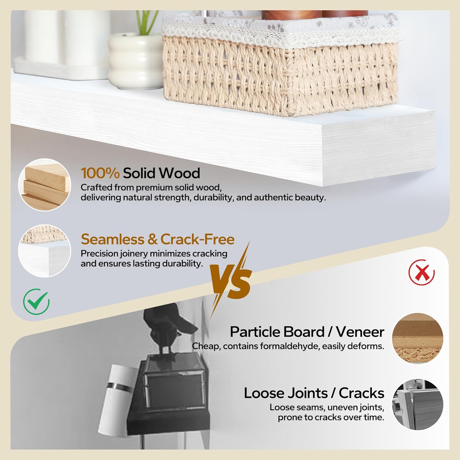 • Every Shelf Is One of a Kind: Each minimalist shelf is carefully handpicked and uniquely crafted. Due to the natural variations in wood grain, patterns, knots, and textures, the color may slightly differ from the sample shown. We strive to match the displayed sample as closely as possible.