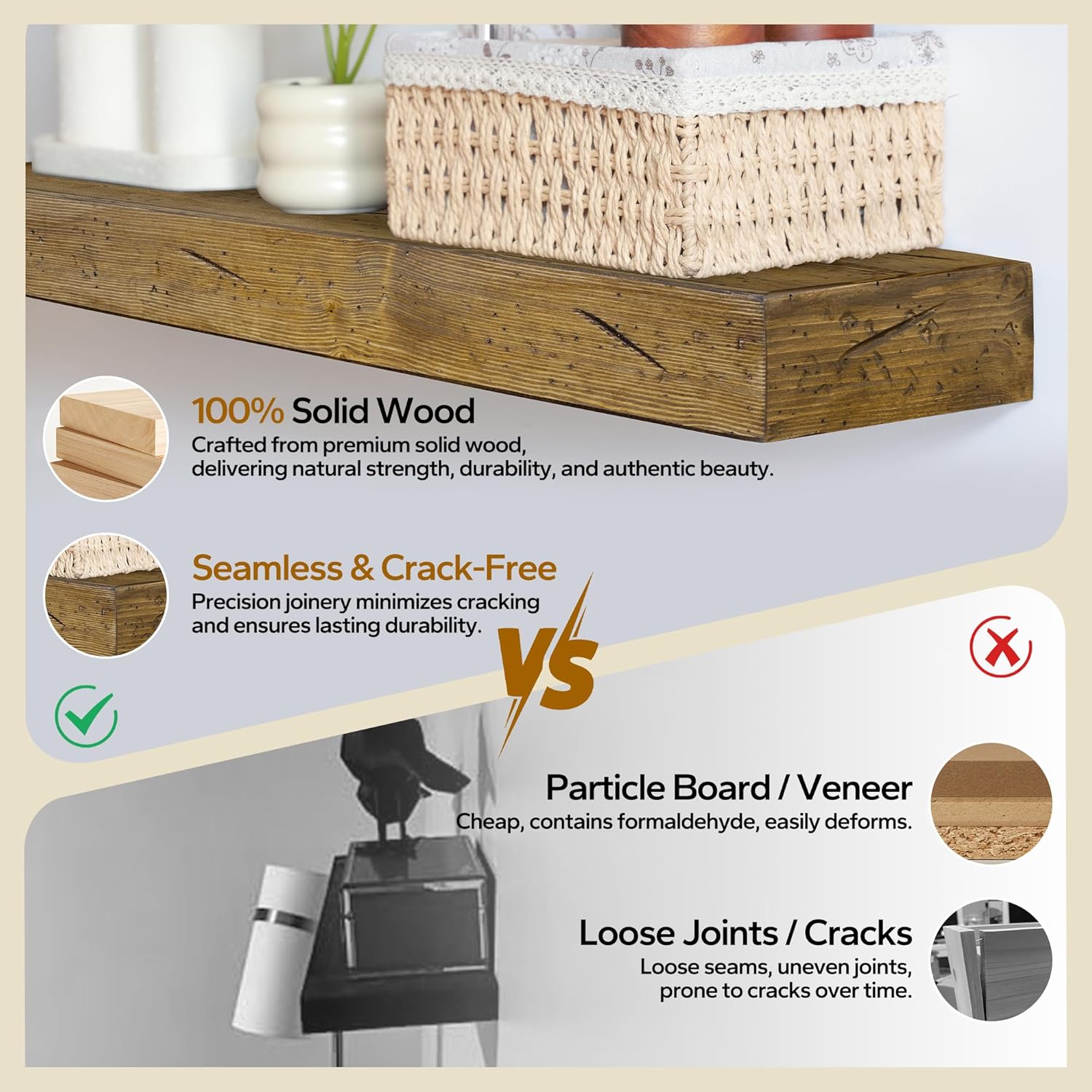 • Premium Handcrafted Solid Wood Shelves: Our floating shelves are made from 100% real solid pine wood, handcrafted to showcase the natural grain and unique knots of the wood. The rustic stain adds a timeless farmhouse charm, enhancing any home decor.