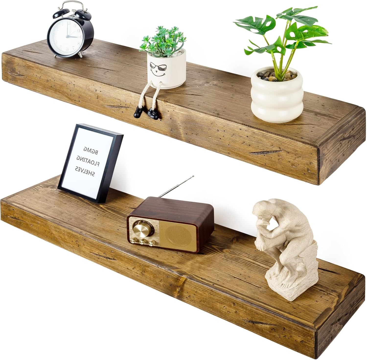 • Premium Handcrafted Solid Wood Shelves: Our floating shelves are made from 100% real solid pine wood, handcrafted to showcase the natural grain and unique knots of the wood. The rustic stain adds a timeless farmhouse charm, enhancing any home decor.