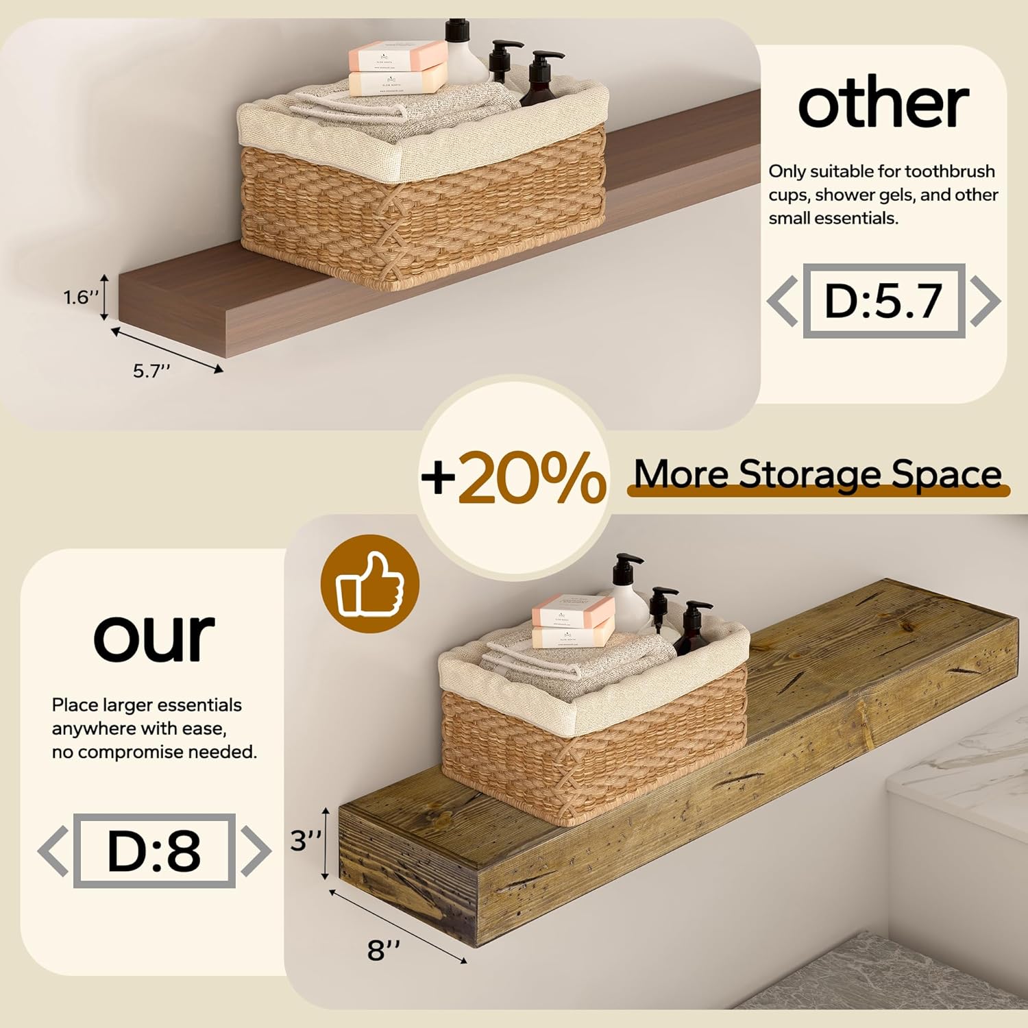 • Stylish and Versatile Storage Solution: Upgrade your living spaces with these 3'' thick rustic wood shelves, perfect for kitchens, bedrooms, bathrooms, living rooms, or offices. They combine rustic charm with modern functionality, serving as both decorative and practical storage.
