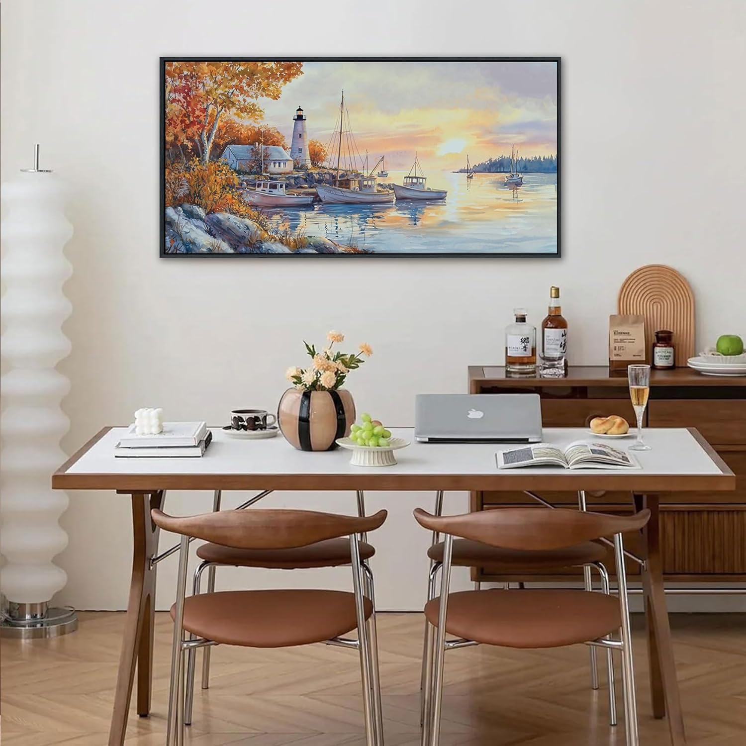 QZQCBLC Sunset Landscape Wall Art, Sea Harbor Lighthouse Ink Paintings Framed Artwork Homeward-bound Boat Soft Tone Wall Pictures for Living room Bedroom Bathroom Home Office Decor 20x40 IN