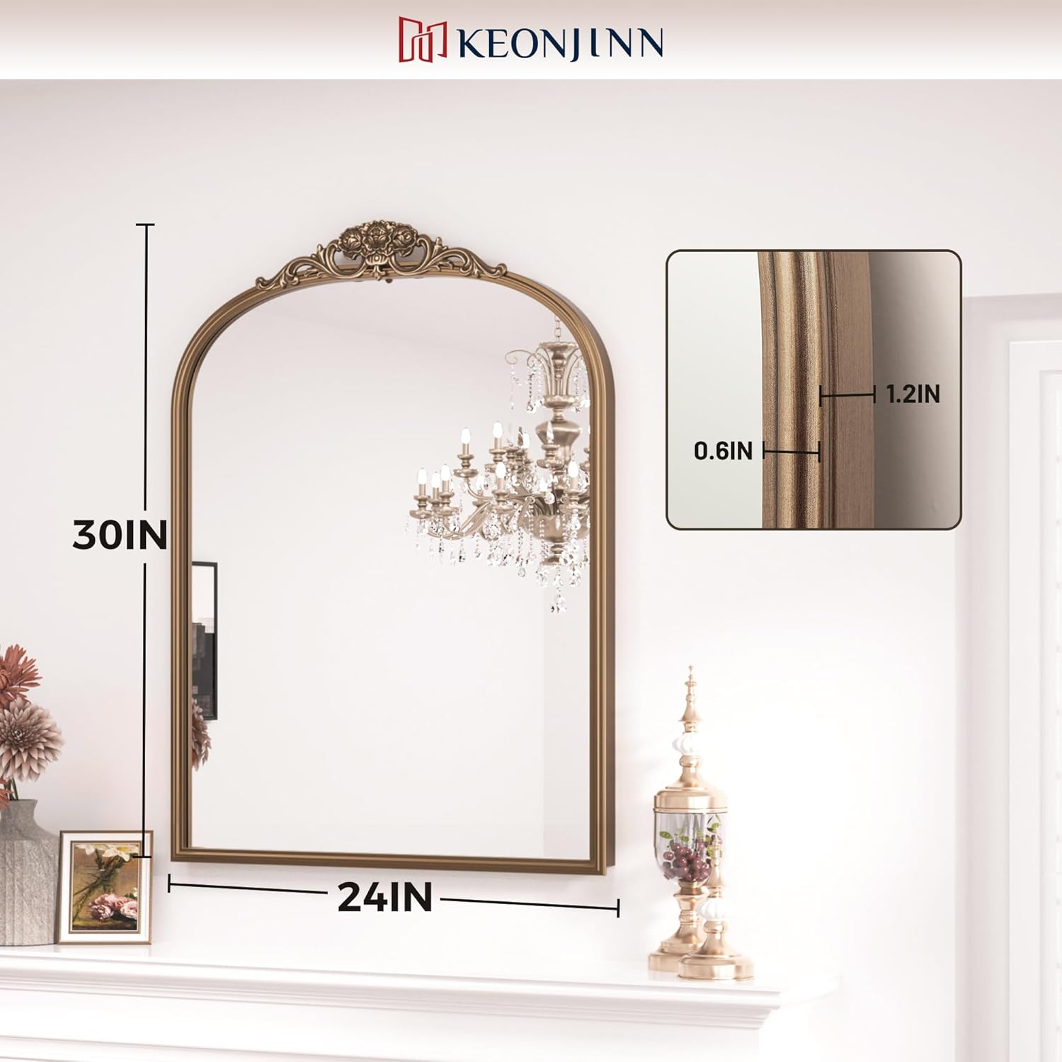 Keonjinn Brass Vintage Arched Mirror for Wall, 24" x 30" Antique Gold Mirrors with Metal Frame, Baroque Style Decoration for Mantle, Bathroom, Living Room, Fireplace, Bedroom, French Cleat Mounting