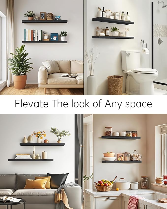 BAYKA Floating Shelves for Wall, 36 inches Long Wall Mounted Rustic Wood Shelves for Bathroom, Bedroom, Living Room, Kitchen, Office, Hanging Shelf for Books/Storage/Decor(Black,Set of 2)