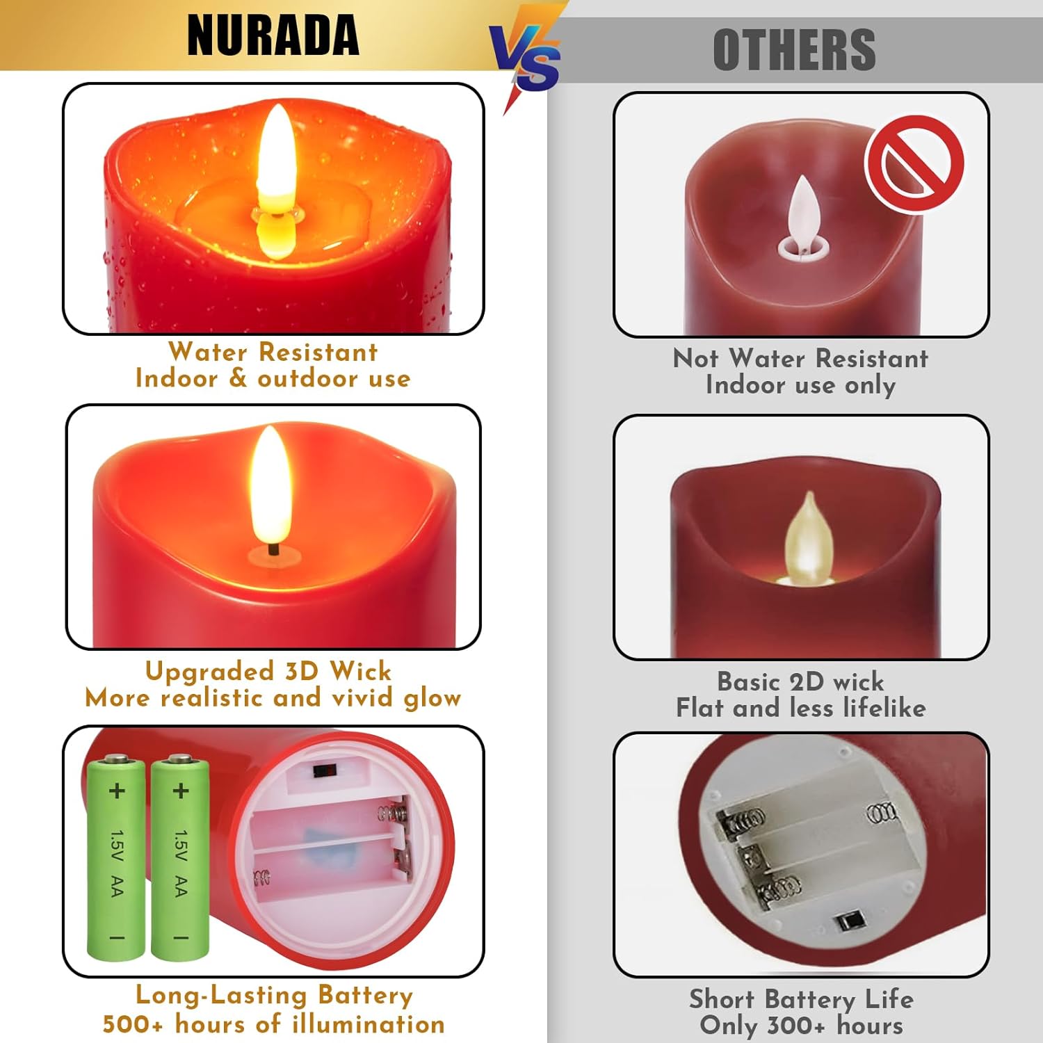 NURADA Outdoor Flameless Candles with Remote Timer - Waterproof Realistic Flickering LED Pillar Electric Battery Operated Fake Candle for Home Wedding Christmas Decor - 2 Pack Red(D3”H6”6”)