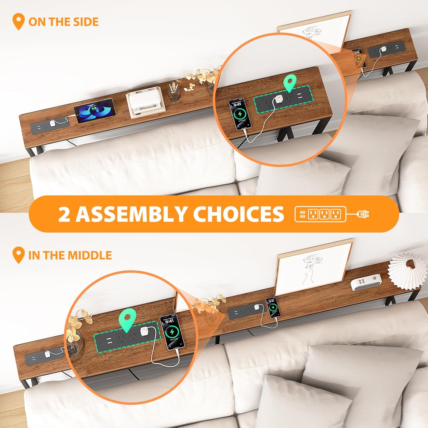 • Couch Table Behind Sofa with 2 Outlets: Narrow entryway table are equipped with 3 120VAC outlets, 2 USB ports and 4.9' long power cord with 5 cable ties. The desktop can adjust the power position as needed, which can effectively use the space behind the sofa to charge phones and laptops