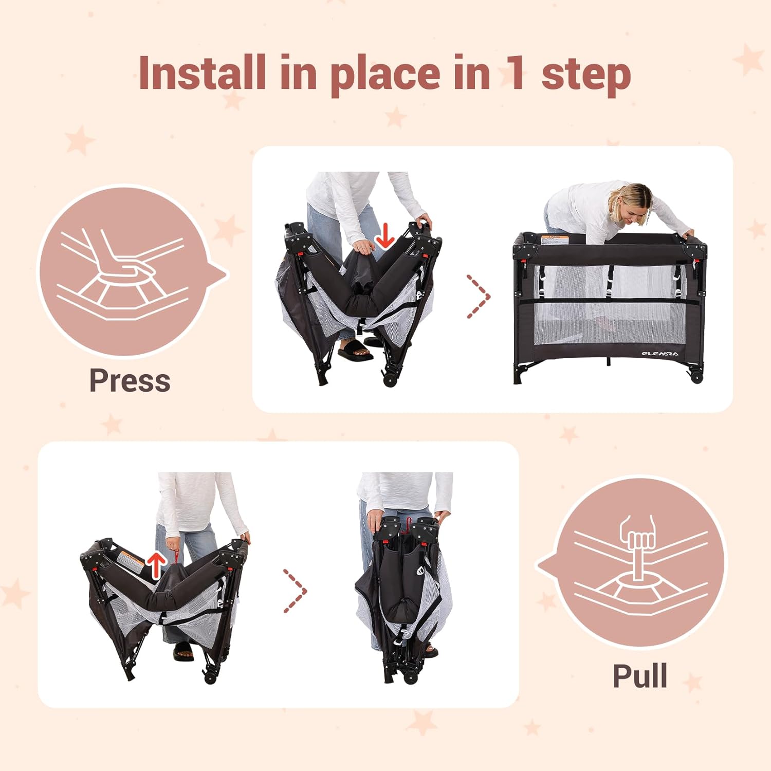 • 👶【Portable Travel Design】This Magic Fold Baby Pack n Play takes only 1 second to complete the opening and closing action,no need to install the armrest,the hand press down the middle support bar immediately open, comes with a travel pouch that takes up very little space after storage, making it very portable and perfect for family trips or visiting friends