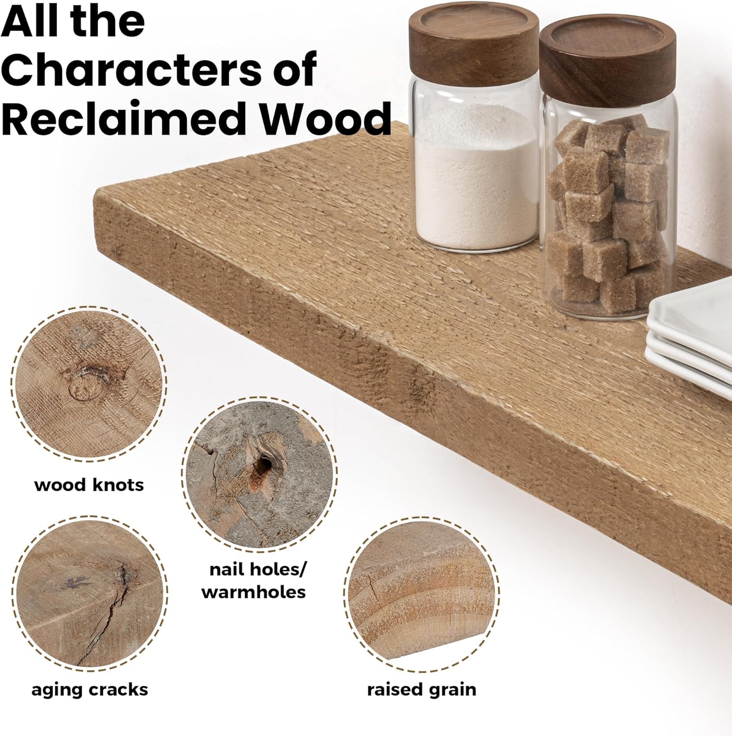 • Authentic Reclaimed Wood -- Our hanging shelves are beautifully crafted from solid reclaimed barnwood with natural markings(nail holes, screw holes, discoloration, scratches, dents, and many other variations), making each piece a unique work of art. These marks reveal the wood's rich history and bring character to your home decor. We do not alter these natural variations, but ensure safety by removing any excess nails and burrs. No two pieces are alike