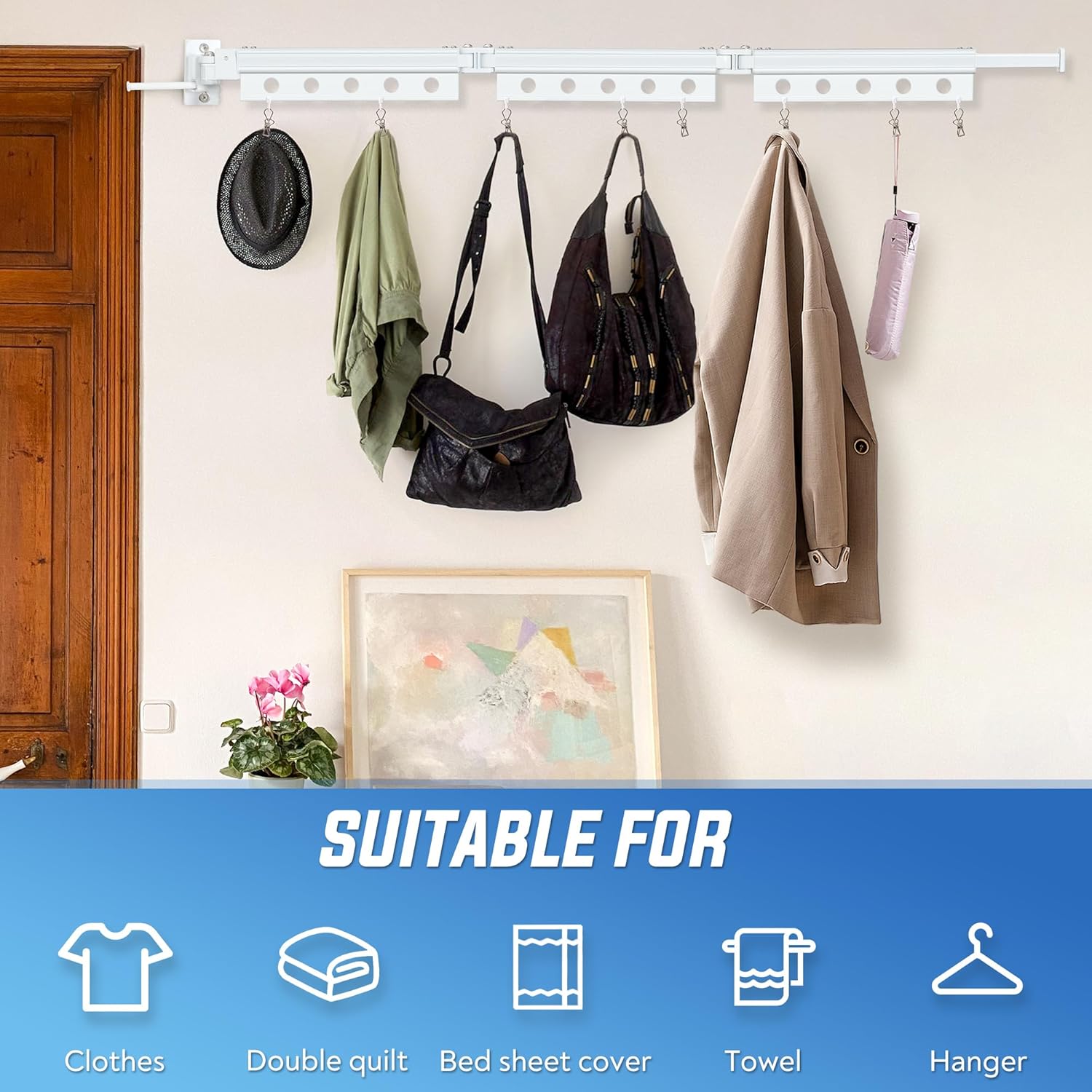• Premium Material & Craftsmanship -- Crafted from space aluminum, our clothes drying rack wall mounted ensures long-lasting durability without rusting. Its multi-layered paint protection guarantees resistance to acids, alkalis, rust, and corrosion, ensuring robust performance over time.