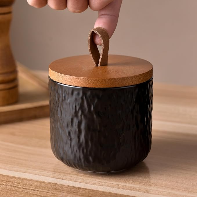 • Bold & Modern Black Stone Texture - Featuring a unique black stone-like texture, these canisters offer a sleek, modern aesthetic that will enhance any kitchen or space. The natural bamboo lids complement the design, adding a touch of warmth to the overall look.