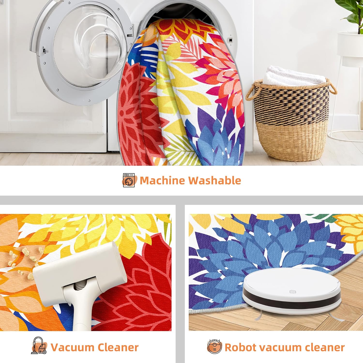 Indoor Outdoor 6FT Round Area Rug Washable Rugs Multicolored Patio Rug Tropical Botanical Modern Floral Indoor Outdoor Round Carpet Non Slip for RV, Pool Deck, Backyard, Porch