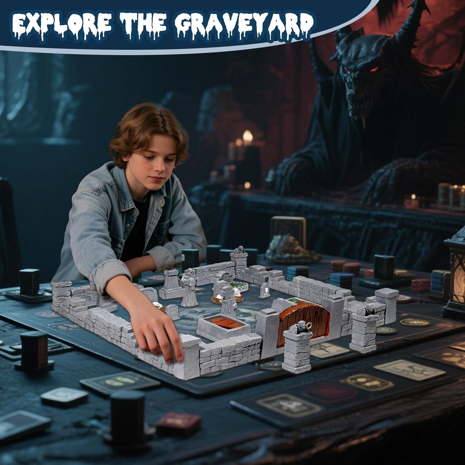 • Modular system, unlimited creativity: Contains 38 combinations and various terrain accessories such as walls, miniature tombstones, crosses, miniature coffins, etc. Players can freely combine these components to create a unique miniature graveyard scene. This highly customizable possibility brings a new experience to the tabletop role-playing scene.