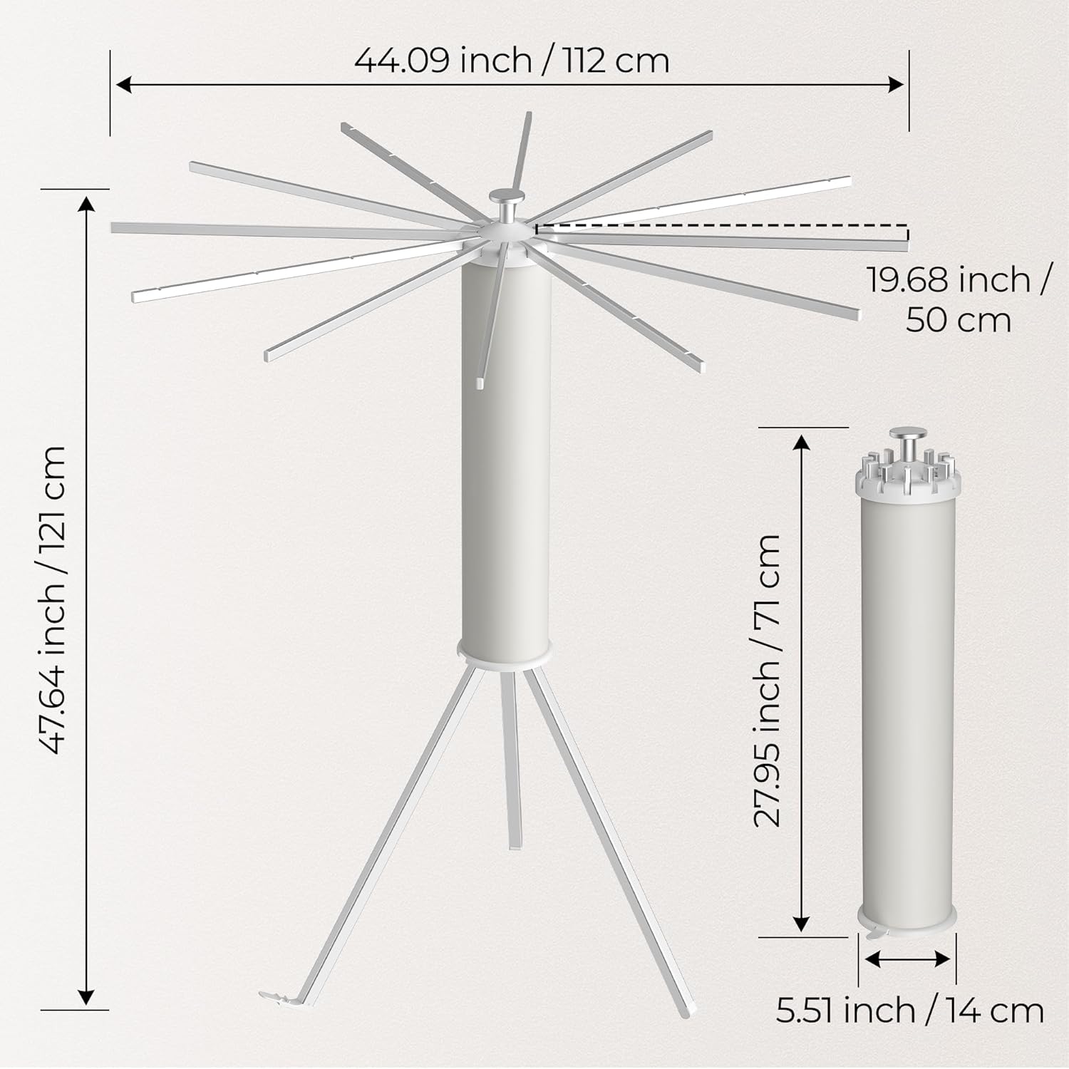 • 【Sturdy and Durable】The clothes drying rack has 12 rods and a strong tripod structure that can support up to 35 pounds of clothing; Depending on your needs for space and usage needs, you can increase the number of arms you require.The folding drying rack's unique tripod design allows it to remain perfectly stable in a limited area.