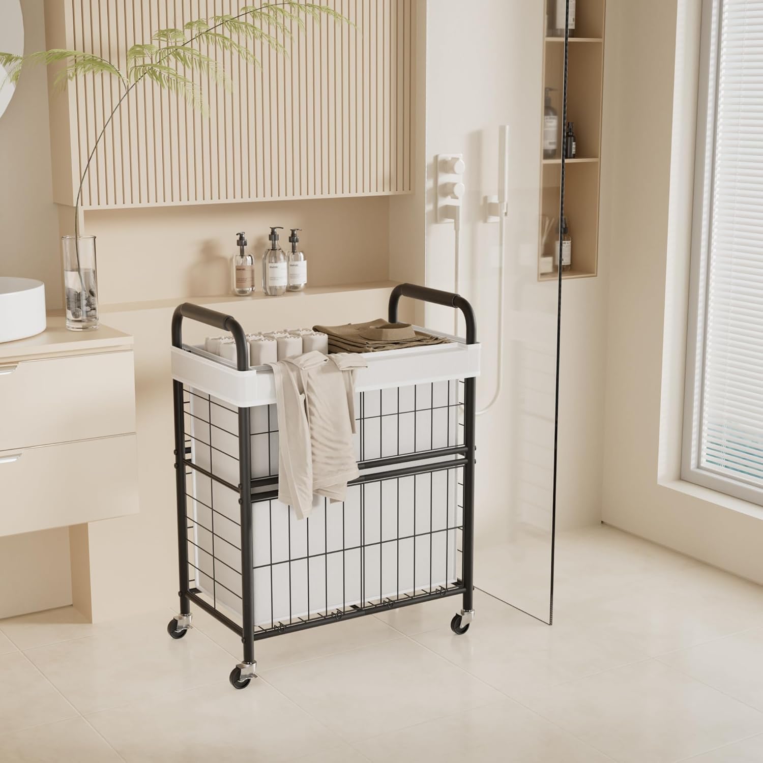 • Premium Quality Materials Laundry Hamper with 2 Compartment: The wheeled laundry sorter cart's frame is high-strength steel with an anti-rust surface. Laundry basket is made of thickened oxford fabric.